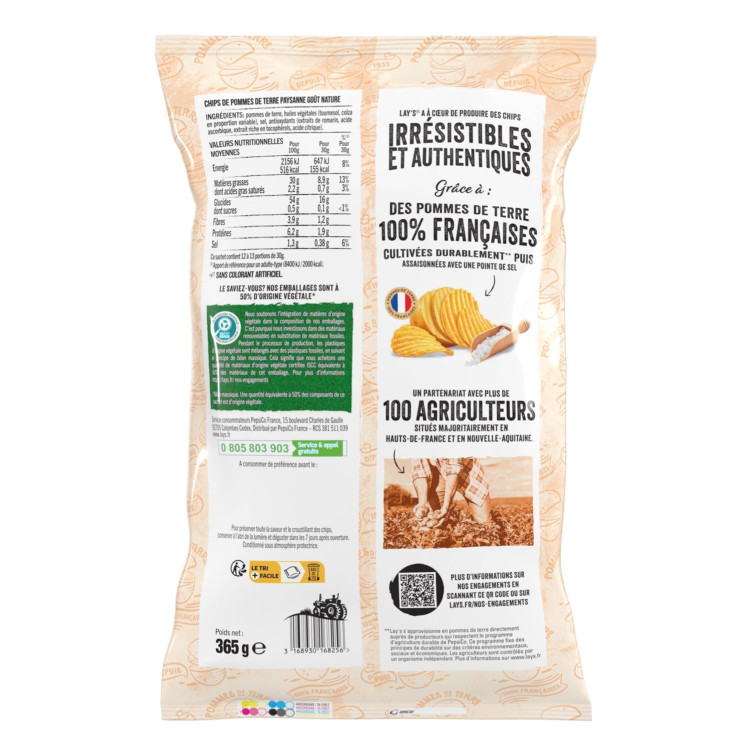 LAY'S RECETTE PAYSANNE: When Lay's combines its unrivaled expertise since 1932 with French agricultural know-how, the result is old-fashioned crisps with a deliciously authentic taste and crispiness. TRADITIONAL EXPERTISE: It is thanks to its traditional know-how that Lay's helps to offer you old-fashioned crisps that are as delicious as ever. Lay's Recette Paysanne is made with potatoes cut into thin slices and gently cooked for extra crispiness. CHIPS TO ENJOY EVERY MOMENT OF EVERY DAY: For an aperitif, at a picnic, at a summer barbecue, or on the go to complete a sandwich: Lay's is with you at each of these moments with its deliciously flavored aperitif biscuits! FRENCH CHIPS: Our Lay's Recette Paysanne range is produced entirely from 100% French potatoes. We are proud to collaborate with our French farmers and to put their agricultural know-how at the service of our chip expertise.