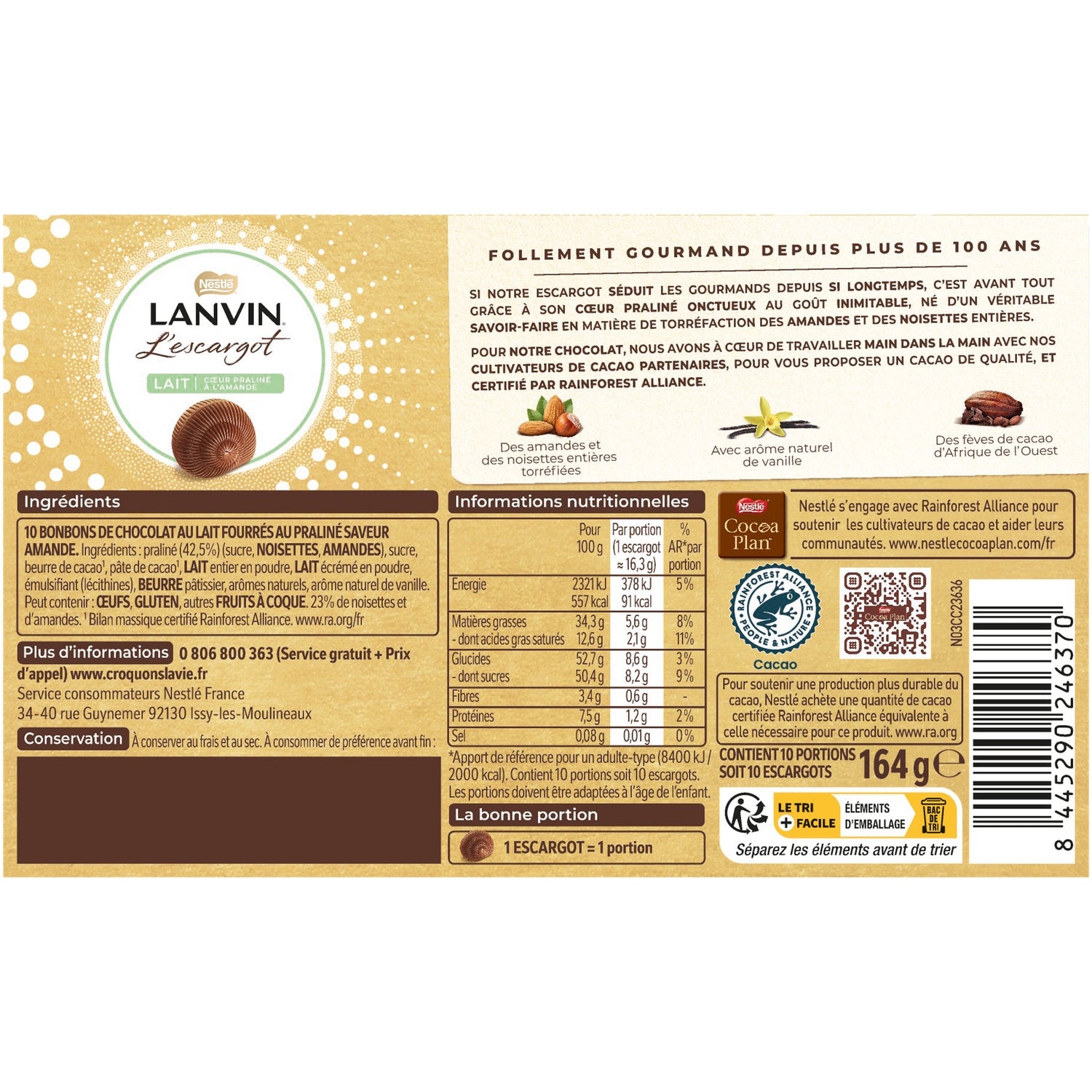 Created in 1934 in Burgundy, the LANVIN Snail will seduce you with its smooth almond-flavored praline made from roasted almonds and hazelnuts and its delicious milk chocolate shell. The inimitable Lanvin praline is revealed… This rich, fruity, smooth and melt-in-the-mouth praline is made from a carefully measured blend of selected almonds and hazelnuts, delicately roasted to enhance the flavors in the mouth… With the NESTLE Cocoa Plan, and in partnership with the Rainforest Alliance, LANVIN is committed to more sustainable cocoa production and helps support farmers and their communities.
