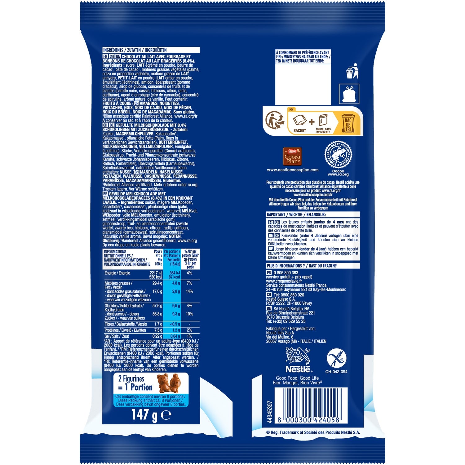 Ingredients: sugar, skimmed MILK powder, cocoa butter¹, cocoa mass¹, vegetable fats (palm, rapeseed in varying proportions), anhydrous MILK fat, WHEY powder, whole MILK powder, emulsifier (lecithins), starch, thickener (acacia gum), glucose syrup, fruit and plant concentrates (black carrot, blackcurrant, hibiscus, lemon, radish, safflower), glazing agent (carnauba wax), spirulina concentrate, natural vanilla flavoring. May contain: NUTS (CH: ALMONDS, HAZELNUTS, PISTACHIOS, WALNUTS, CASHEW NUTS, PECANS, BRAZIL NUTS, MACADAMIA NUTS). ¹Rainforest Alliance certified mass balance. www.ra.org/fr. To support more sustainable cocoa production, Nestlé purchases an equivalent amount of Rainforest Alliance certified cocoa to that needed for this product.