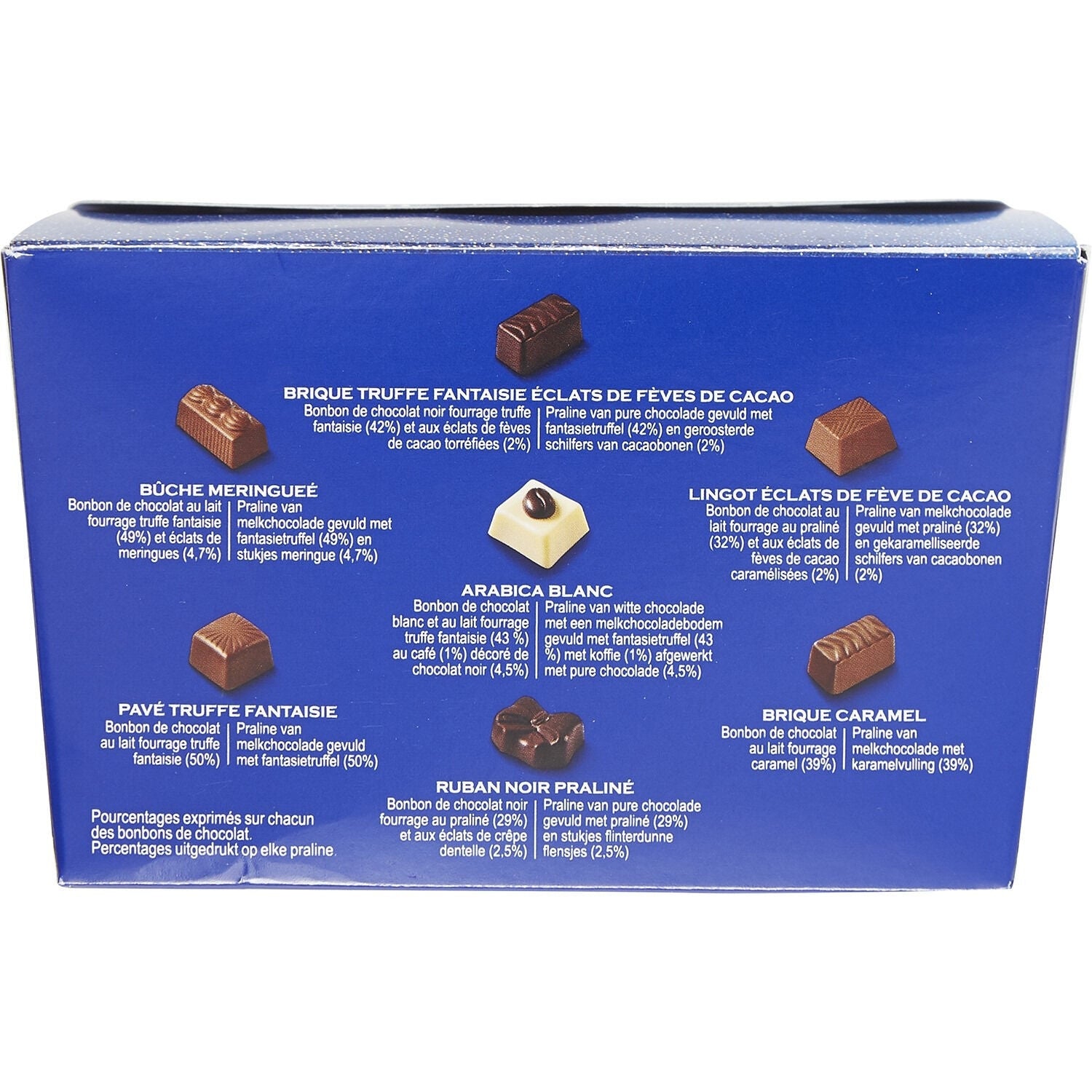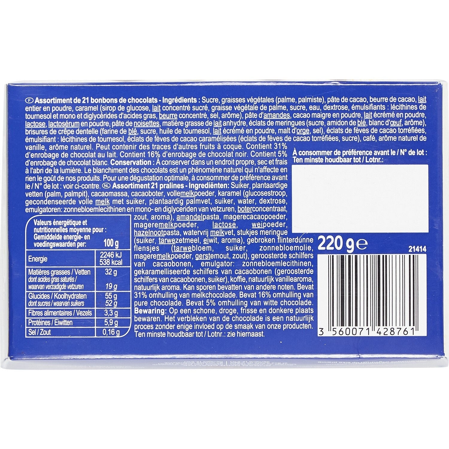 Sugar, vegetable fats (palm, palm kernel), cocoa mass, cocoa butter, whole MILK powder, caramel (glucose syrup, sweetened condensed MILK, vegetable palm fat, sugar, water, dextrose, emulsifiers: sunflower lecithins and mono and diglycerides of fatty acids, concentrated BUTTER, salt, flavoring), ALMOND paste, fat-reduced cocoa powder, skimmed MILK powder, LACTOSE, WHEY powder, HAZELNUT paste, anhydrous MILK fat, meringue pieces (sugar, WHEAT starch, EGG white, flavoring), crêpe dentelle pieces (WHEAT flour, sugar, sunflower oil, skimmed MILK powder, BARLEY malt, salt), roasted cocoa bean pieces, emulsifier: sunflower lecithins, caramelized cocoa bean pieces (cocoa bean pieces roasted cocoa, sugar), coffee, natural vanilla flavoring, natural flavoring. Contains 31% MILK chocolate coating. Contains 16% dark chocolate coating. Contains 5% white chocolate coating.
