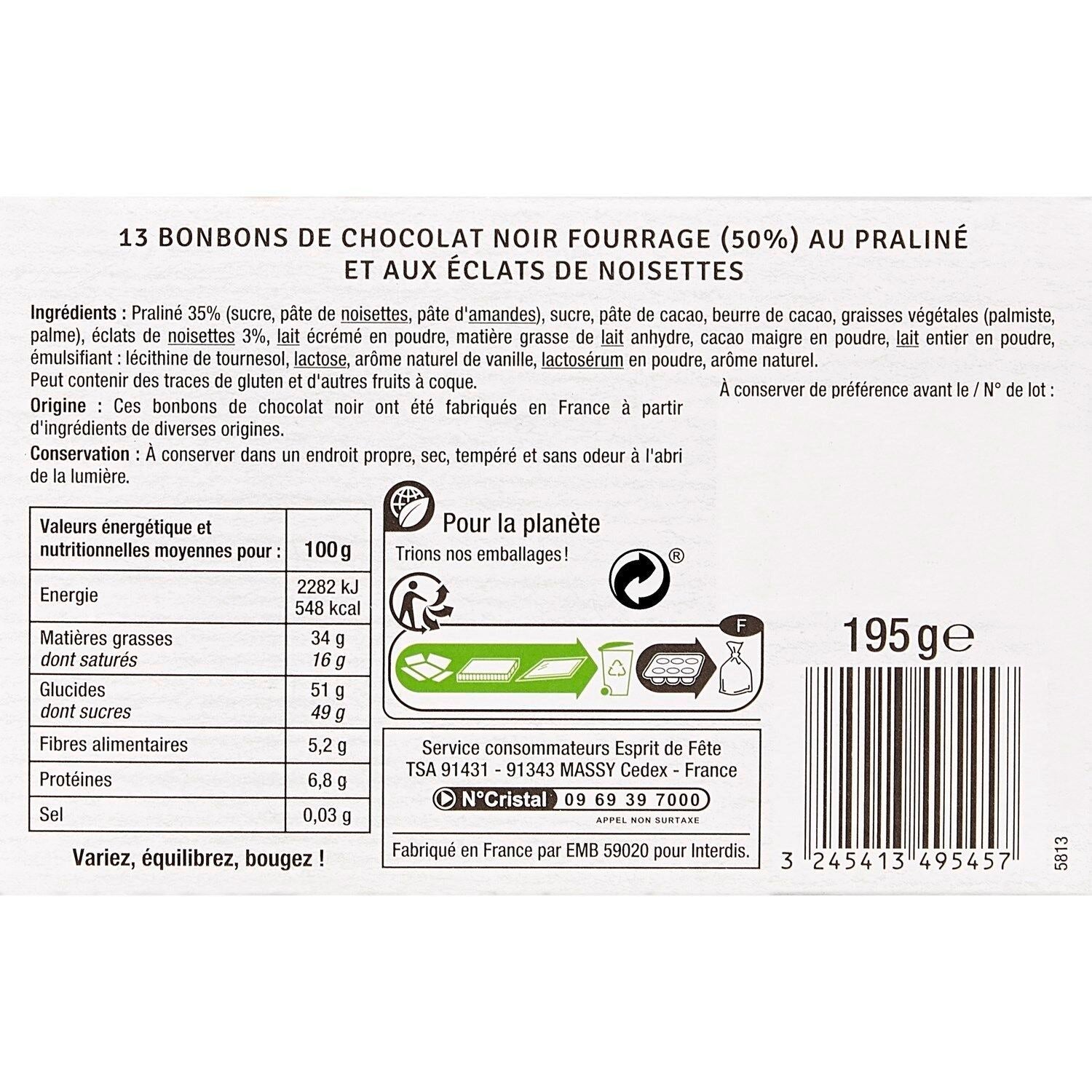 13 dark chocolate candies filled (50%) with praline and hazelnut pieces