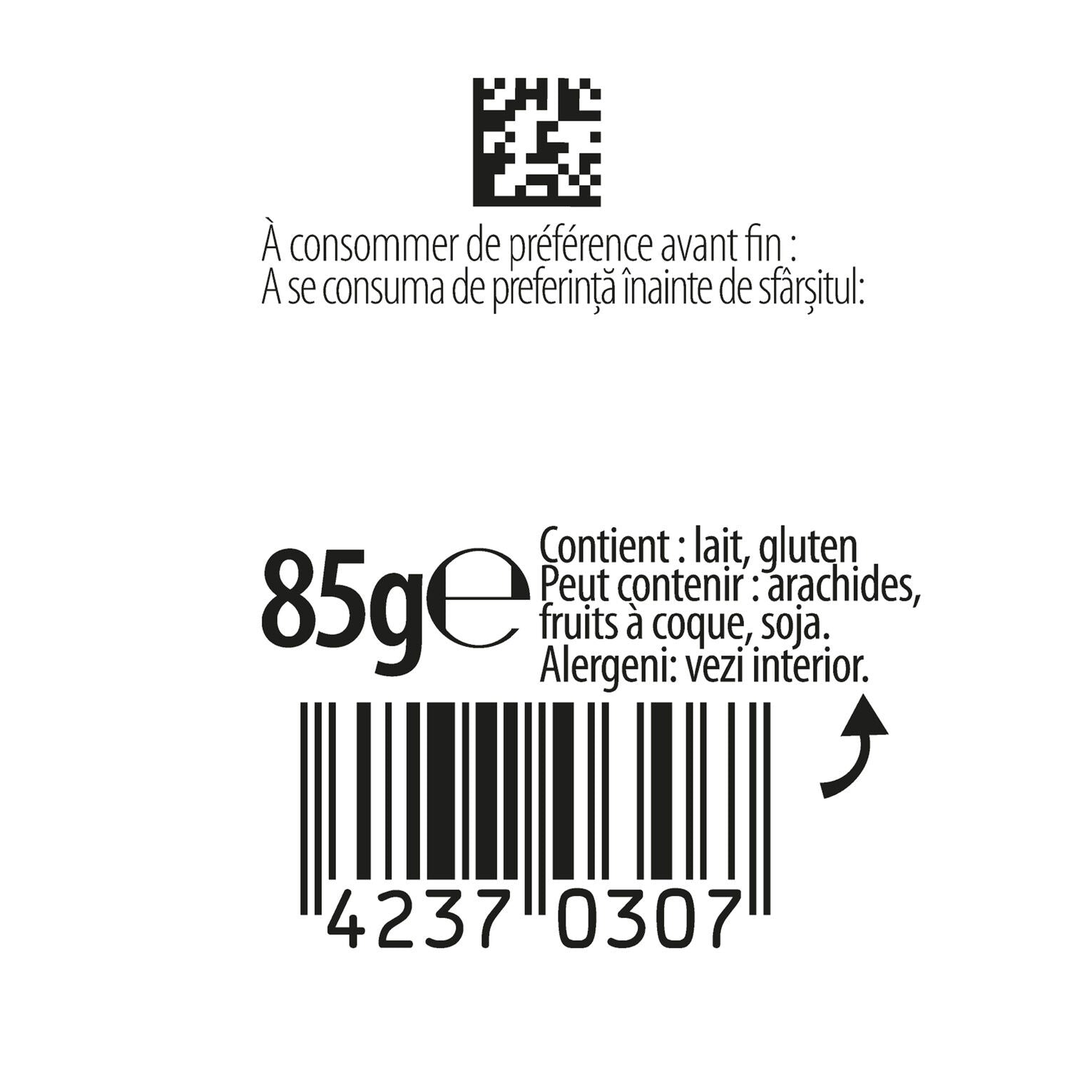 Ingredients: Sugar, skimmed MILK powder, cocoa butter, cocoa mass, anhydrous MILK fat, emulsifier (lecithins), WHEAT flour, WHEY powder, rice starch, natural vanilla flavoring, colors (beetroot red, carotenoids, curcumin), spirulina concentrate, glazing agents (carnauba wax, white beeswax), plant concentrates (safflower, radish), BARLEY malt extract. Cocoa: 29% minimum in MILK chocolate. May contain: PEANUTS, NUTS, SOYA.