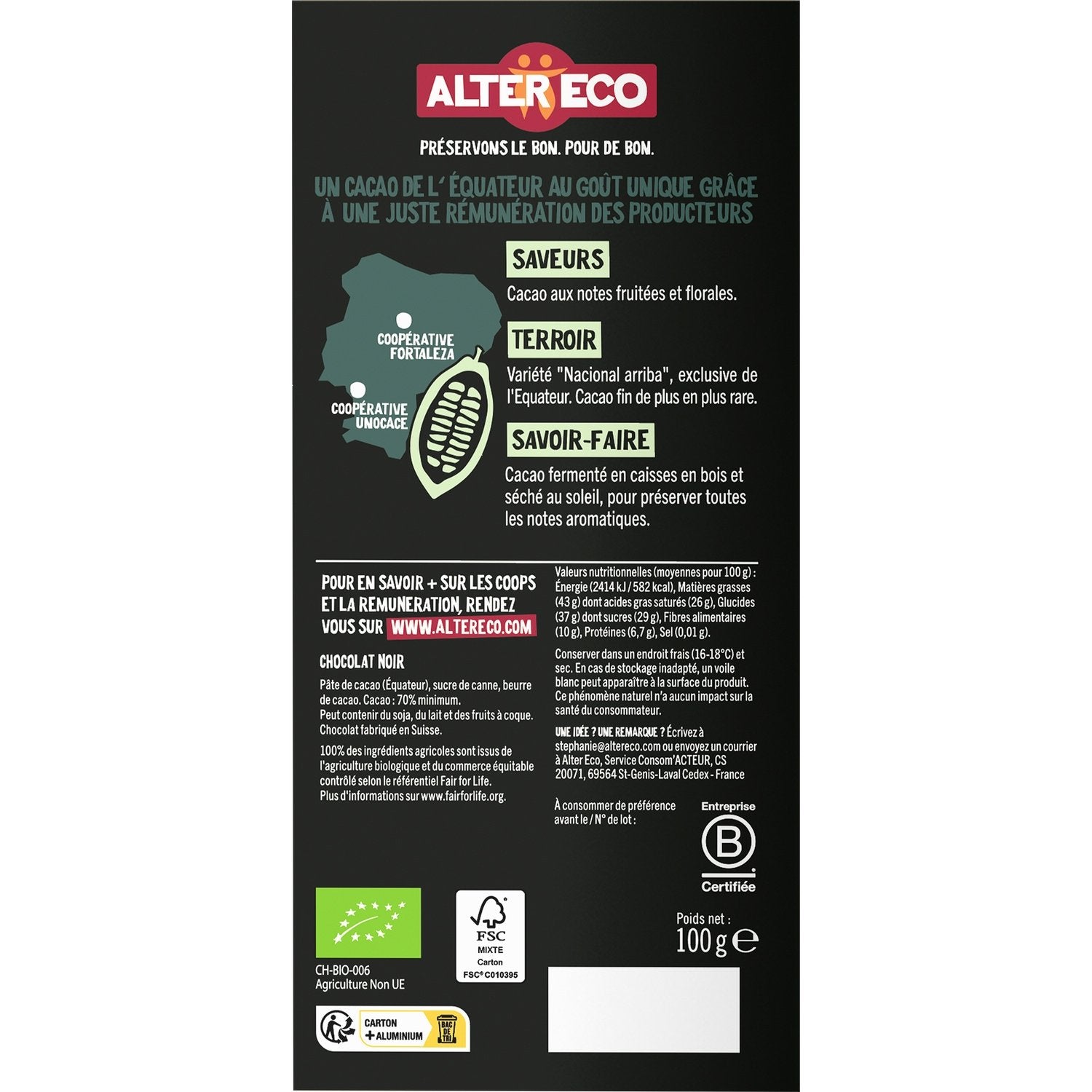 Discover Alter Eco's 70% cocoa Ecuador dark chocolate and indulge in its floral and woody aromas. Organic and fair trade, this is the ideal chocolate bar for more responsible consumption, from breakfast to afternoon tea.