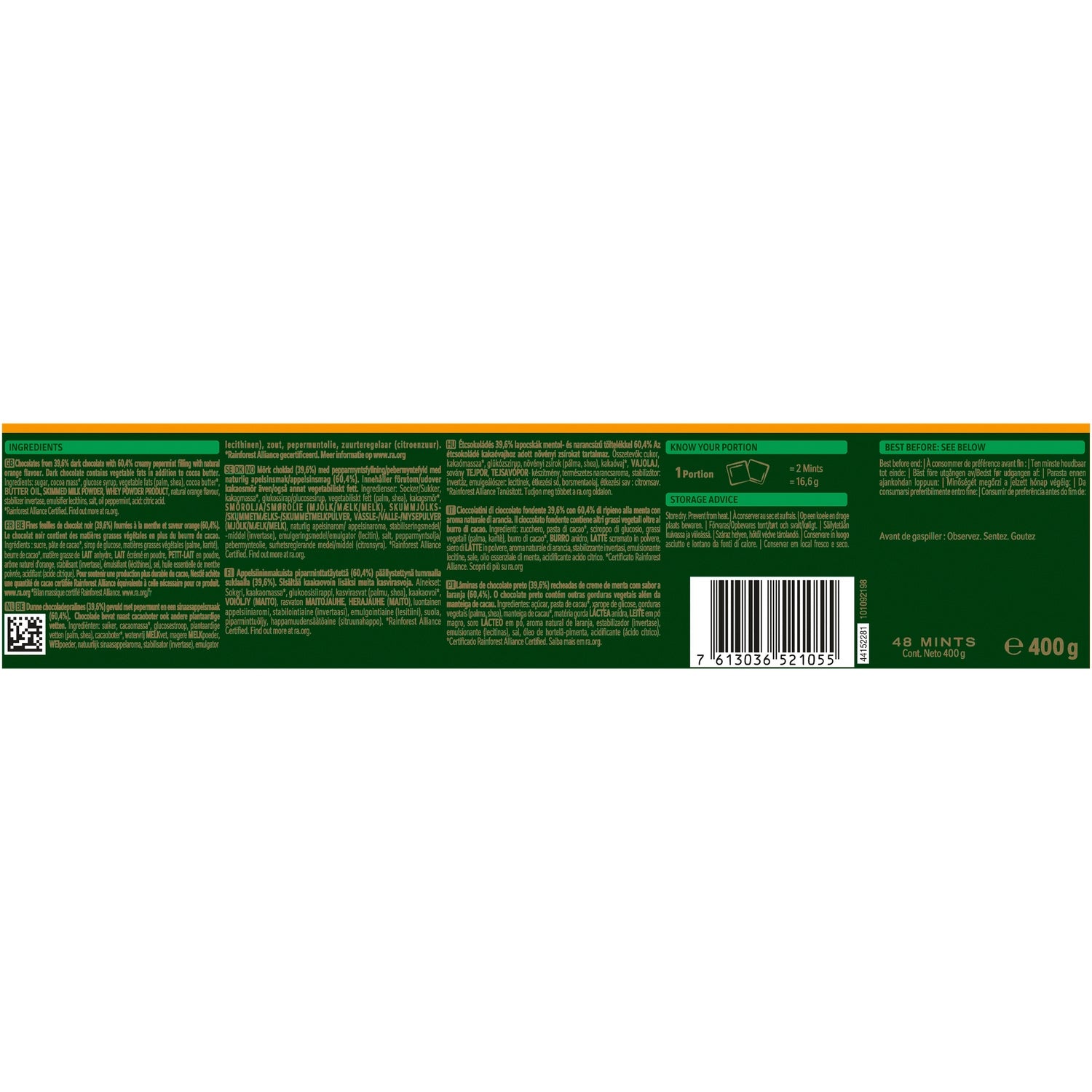 Discover our range of AFTER EIGHT Christmas chocolates and its must-have AFTER EIGHT Orange! AFTER EIGHT Orange is the unique and subtle combination of fine dark chocolate leaves, a melting mint filling, and a delicate orange flavor. Let yourself be tempted by this classic and timeless blend in an ideal format to share with family or friends! (48 leaves). With the NESTLE Cocoa Plan, and in partnership with the Rainforest Alliance, AFTER EIGHT is committed to more sustainable cocoa production and helps support farmers and their communities.