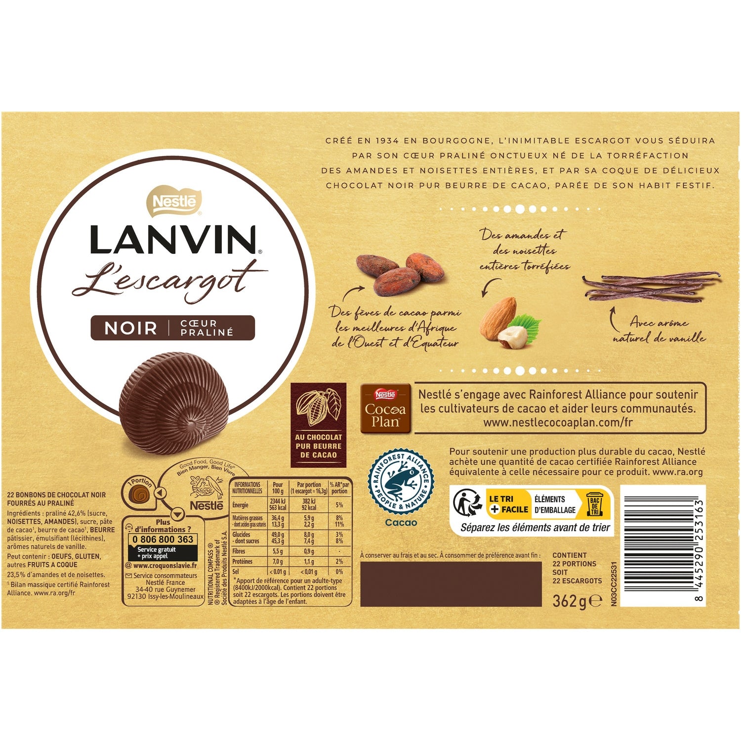 Created in 1934 in Burgundy, the LANVIN Escargot will seduce you with its smooth praline made from roasted almonds and hazelnuts and its delicious dark chocolate shell. The inimitable Lanvin praline is revealed… This rich, fruity, smooth praline melts in the mouth and is composed of a skillfully measured blend of selected almonds and hazelnuts, delicately roasted to enhance the aromas in the mouth…