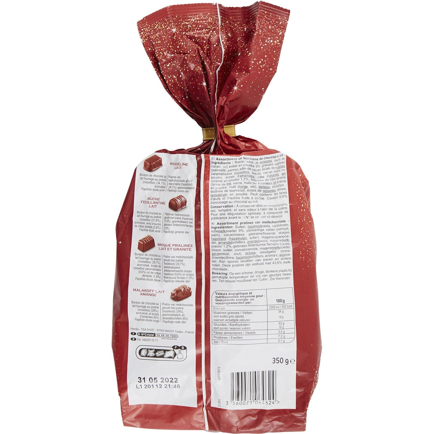 Sugar, HAZELNUT paste, cocoa butter, whole MILK powder, vegetable fats (palm kernel, palm), cocoa paste, caramelized HAZELNUT pieces (HAZELNUTS, sugar), fat-reduced cocoa powder, ALMOND pieces, ALMOND paste, skimmed MILK powder, crêpe dentelle pieces (WHEAT flour, sugar, sunflower oil, skimmed MILK powder, BARLEY malt, salt), LACTOSE, emulsifier: sunflower lecithin, HAZELNUT pieces, flavorings, WHEY powder. Contains 43.6% MILK chocolate coating