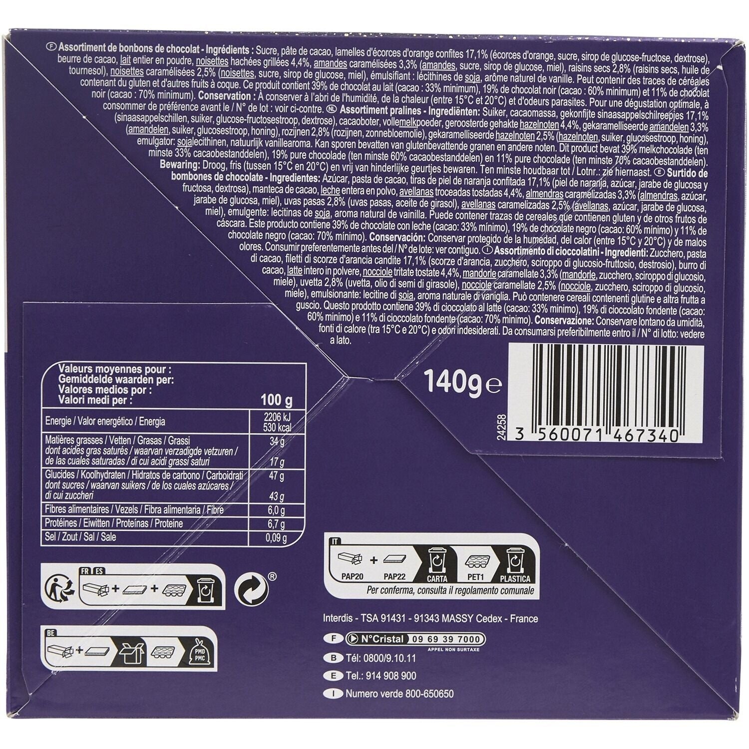 Sugar, cocoa mass, candied orange peel strips 17.1% (orange peel, sugar, glucose-fructose syrup, dextrose), cocoa butter, whole MILK powder, roasted chopped HAZELNUTS 4.4%, caramelized ALMONDS 3.3% (ALMONDS, sugar, glucose syrup, honey), raisins 2.8% (raisins, sunflower oil), caramelized HAZELNUTS 2.5% (HAZELNUTS, sugar, glucose syrup, honey), emulsifier: SOYA lecithins, natural vanilla flavoring. This product contains 39% MILK chocolate (cocoa: 33% minimum), 19% dark chocolate (cocoa: 60% minimum) and 11% dark chocolate (cocoa: 70% minimum).