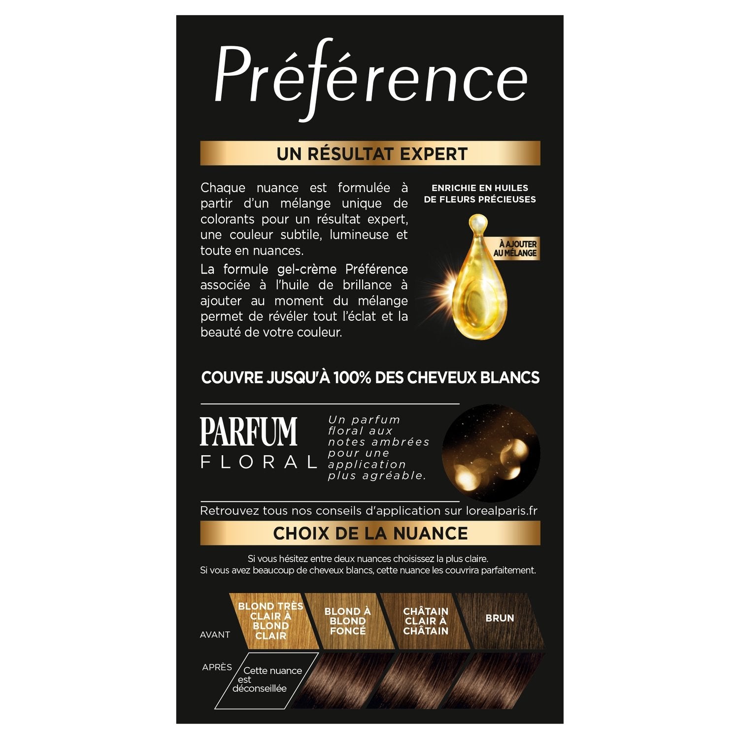 Deep and luminous color rich in reflections. New shine oil enriched with precious flowers included in the kit. Each shade is formulated from a unique blend of colorants for an expert result, a subtle, luminous color, full of nuances. The Preference gel-cream formula combined with the new shine oil to be added at the time of mixing allows to reveal all the radiance and beauty of your color. New floral fragrance with amber notes for a more pleasant application. Covers 100% of gray hair.