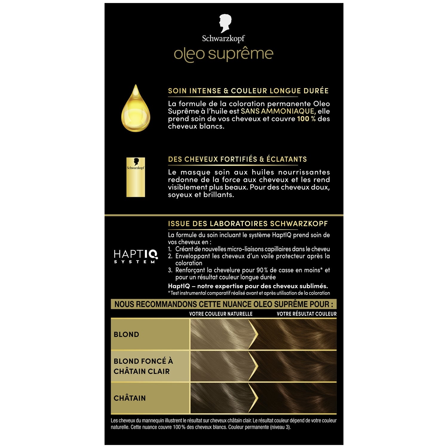 INTENSE CARE & LONG-LASTING COLOR The Oleo Suprême permanent oil coloring formula is AMMONIA-FREE, it cares for your hair and covers 100% of gray hair. STRENGTHENED & RADIANT HAIR The treatment mask with nourishing oils restores strength to the hair and makes it visibly more beautiful. For soft, silky and shiny hair.