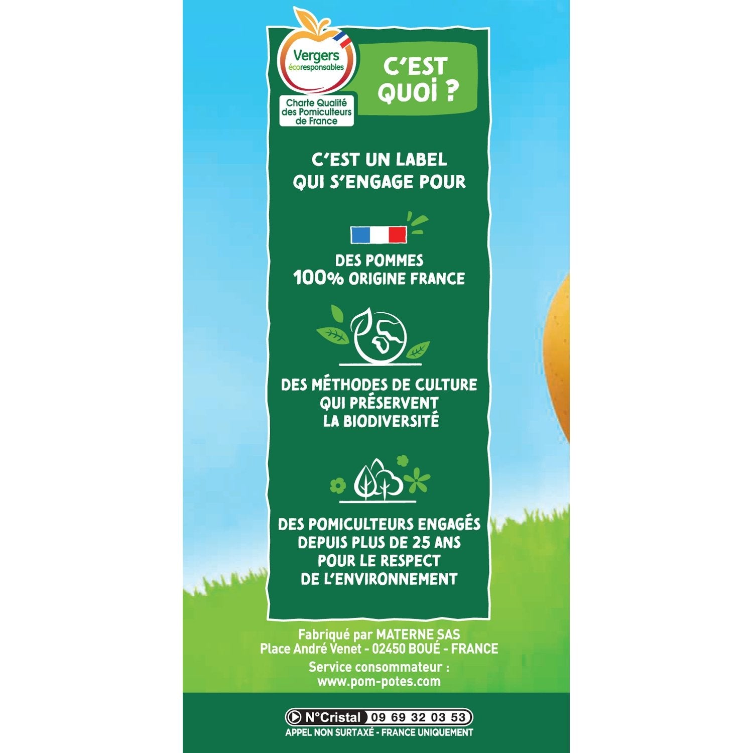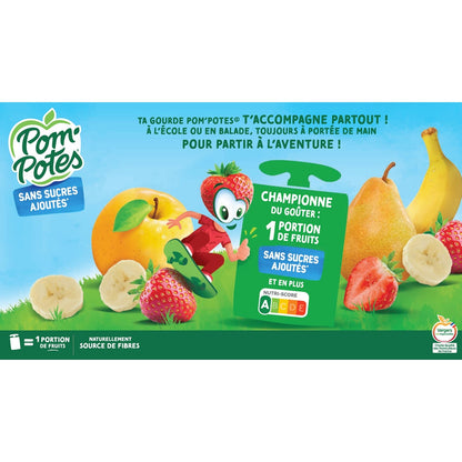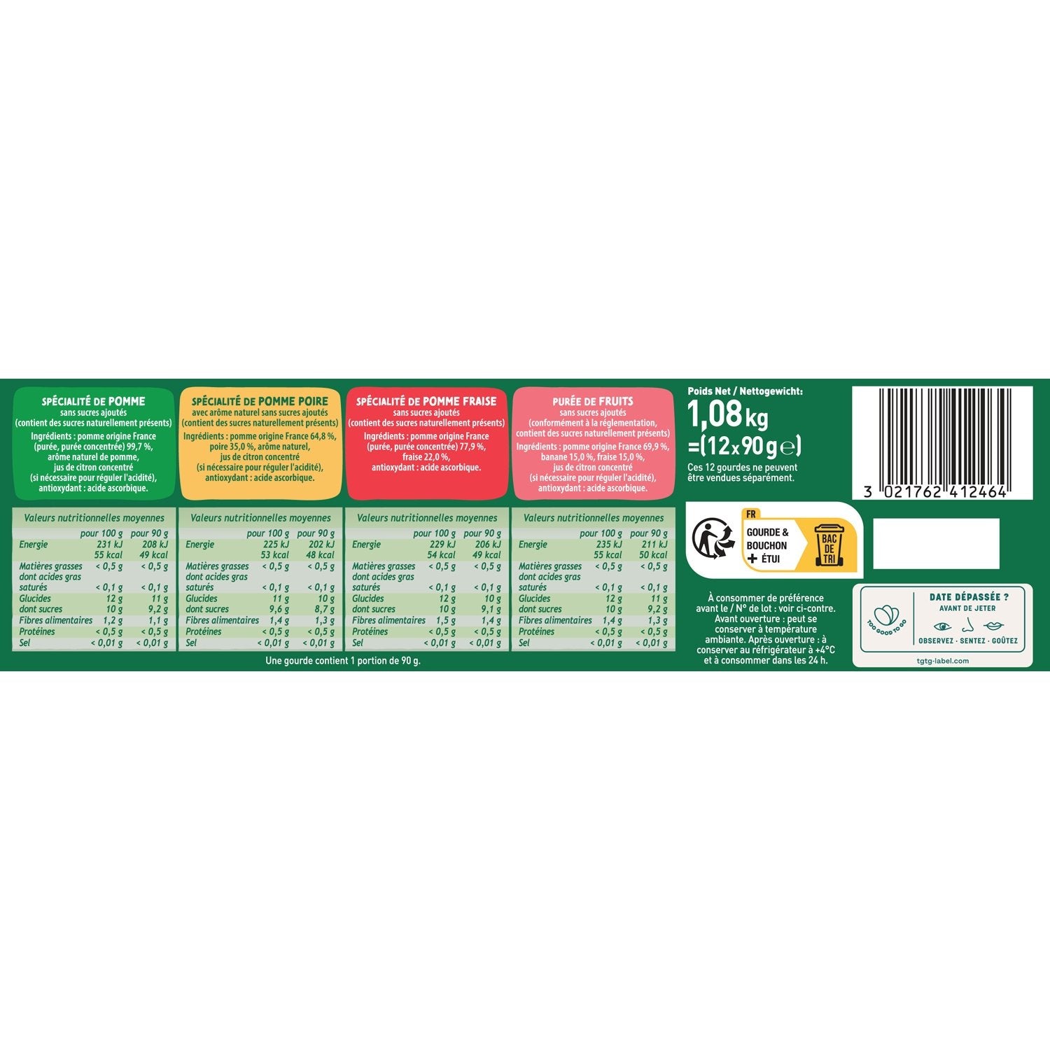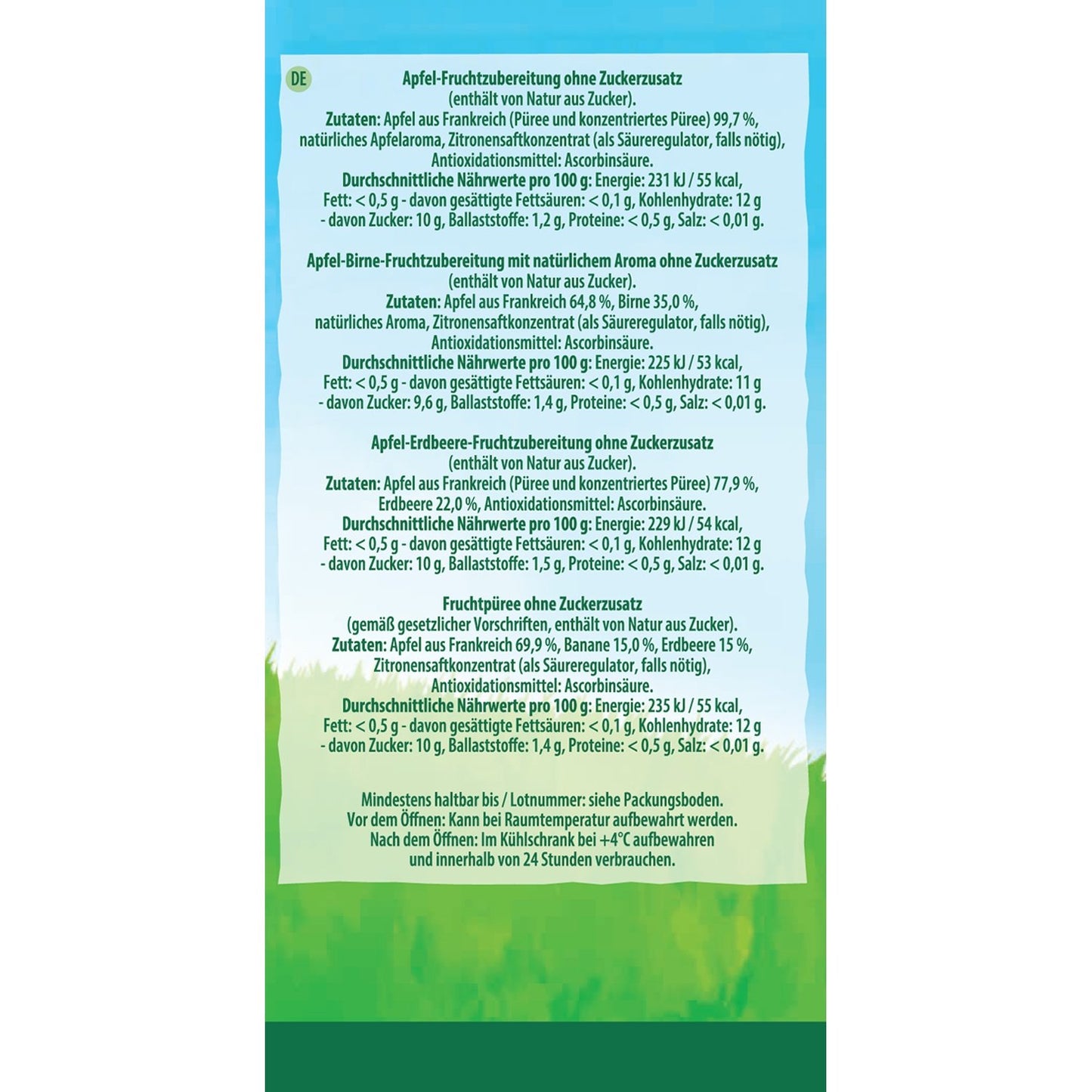 Apple: Apple from France 99.7% (puree and concentrated purée), natural apple flavoring, concentrated lemon juice (if necessary to regulate acidity), antioxidant: ascorbic acid. Apple Pear: Apple from France 64.8% (puree and concentrated purée), pear 35.0%, concentrated lemon juice (if necessary to regulate acidity), antioxidant: ascorbic acid. Apple Strawberry: Apple from France 77.9% (puree and concentrated purée), strawberry 22.0%, blackcurrant, antioxidant: ascorbic acid. Apple Banana Strawberry: Apple from France 69.9%, banana 15.0%, strawberry 15.0%, concentrated lemon juice (if necessary to regulate acidity), antioxidant: ascorbic acid.