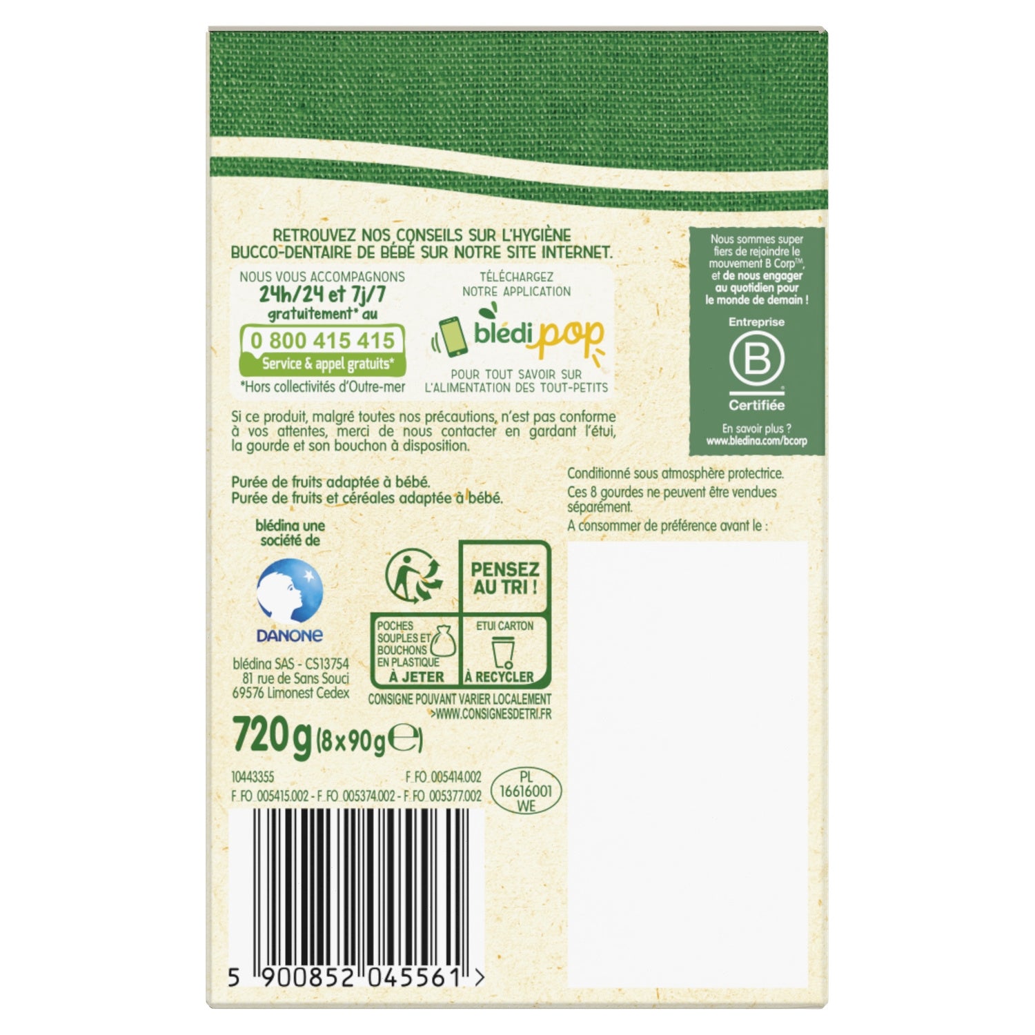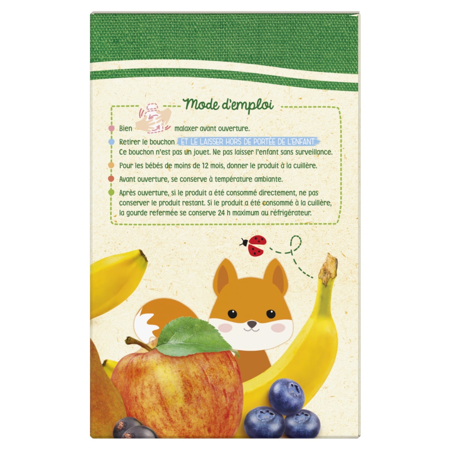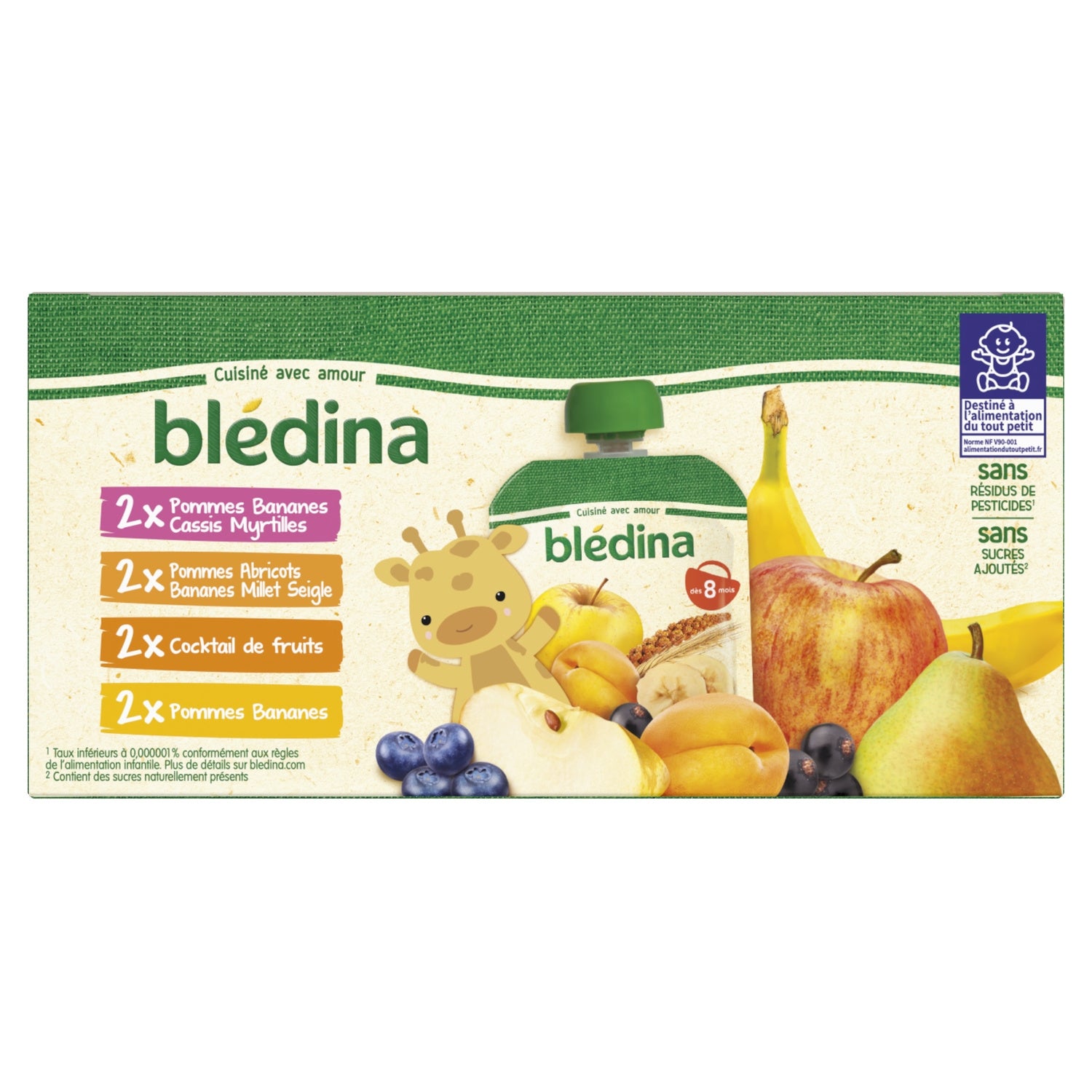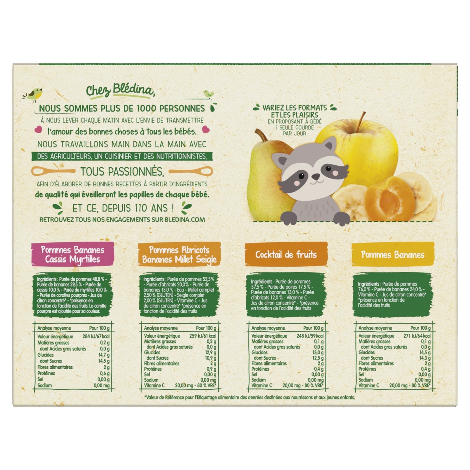 BLEDINA Pouches Fruit Cocktail: Apple puree 57.5% - Pear puree 17.5% - Banana puree 13.0% - Apricot puree 12.0% - Vitamin C - Concentrated lemon juice* - *presence depending on the acidity of the fruit BLEDINA Pouches Apple Banana: Apple puree 76.0% - Banana puree 24.0% - Vitamin C - Concentrated lemon juice* *presence depending on the acidity of the fruit BLEDINA Pouches Apple Apricot Banana Millet Rye: Apple puree 52.5% - Apricot puree 20.0% - Banana puree 15.0% - Water - Wholemeal millet 2.50% (GLUTEN) - Wholemeal rye 2.00% (GLUTEN) - Vitamin C - Lemon juice concentrated* *presence depending on the acidity of the fruits BLEDINA Gourds Apples Bananas Blackcurrants Blueberries: Apple puree 48.8% - Banana puree 29.5% - Blackcurrant puree 10.0% - Blueberry puree 10.0% - Purple carrot puree - Concentrated lemon juice* - *presence depending on the acidity of the fruits. Purple carrot is added for its color.