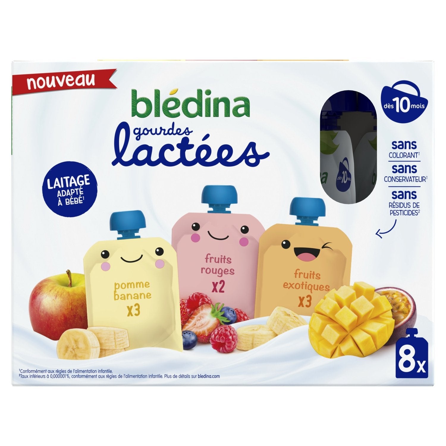BLEDINA Red Fruit Milk Pouches: Ingredients: Whole MILK 40.0% (MILK) - Fresh cottage cheese 20.0% (MILK) - Banana puree 13.2% - Strawberry puree 10.0% - Raspberry puree 5.00% - Blueberry puree 5.00% - Rice flour - Sugar - Stabilizer: Pectin - Concentrated lemon juice* - Natural flavoring - Vitamin C - Lactic ferments (MILK). *presence depending on the acidity of the fruits. BLEDINA Apple Banana Milk Pouches: Ingredients: Whole MILK 40.0% (MILK) - Apple puree 24.1% - Fresh cottage cheese 20.0% (MILK) - Banana puree 10.0% - Rice flour - Sugar - Stabilizer: Pectin - Concentrated lemon juice* - Vitamin C - Lactic ferments (MILK). *presence depending on the acidity of the fruit. BLEDINA Exotic Fruit Milk Pouches: Ingredients: Whole MILK 45.0% (MILK) - Mango puree 19.8% - Fresh cottage cheese 15.0% (MILK) - Banana puree 12.0% - Rice flour - Passion fruit juice 2.50% - Sugar - Stabilizer: Pectin - Concentrated lemon juice* - Lactic ferments (LAI T). *presence depending on the acidity of the fruit.