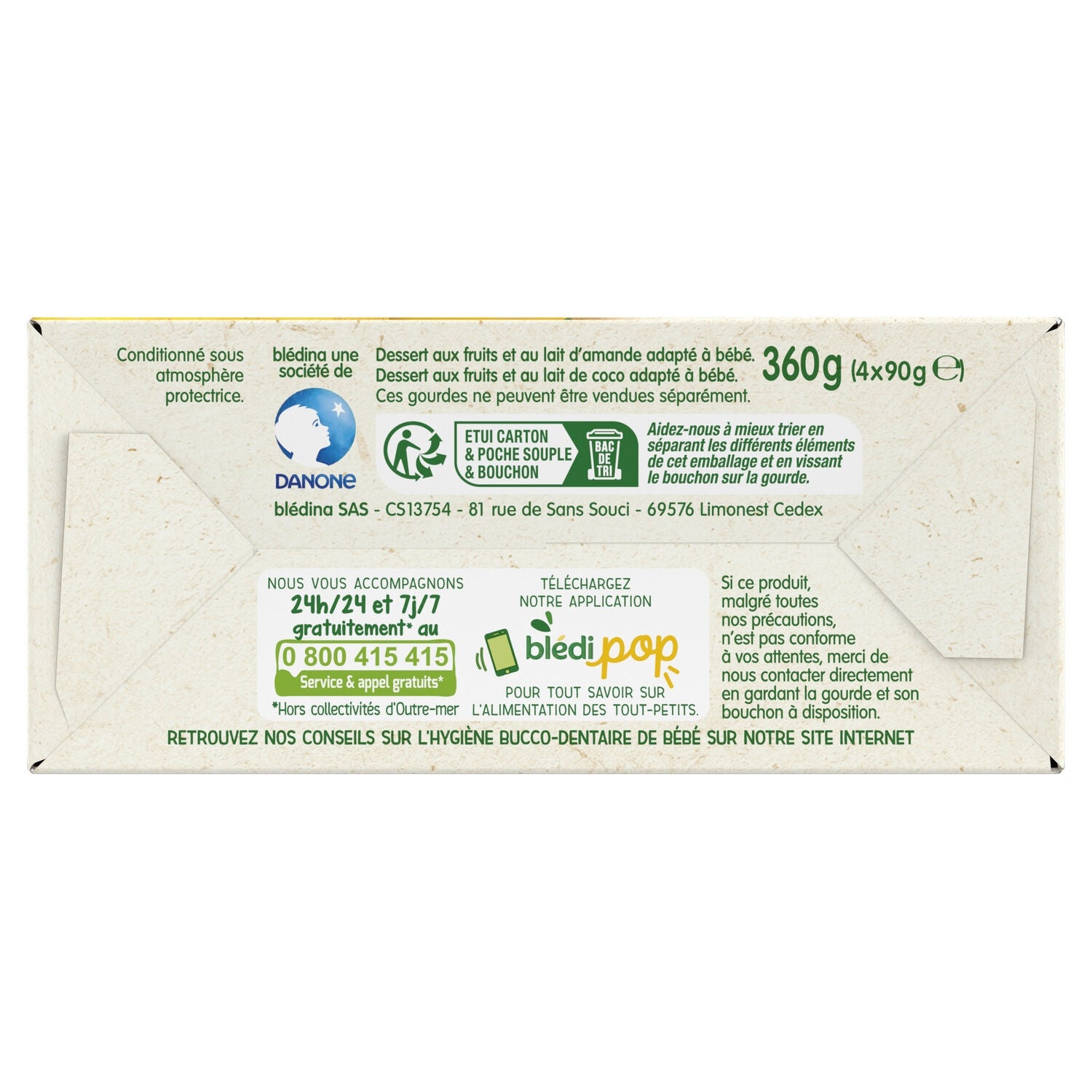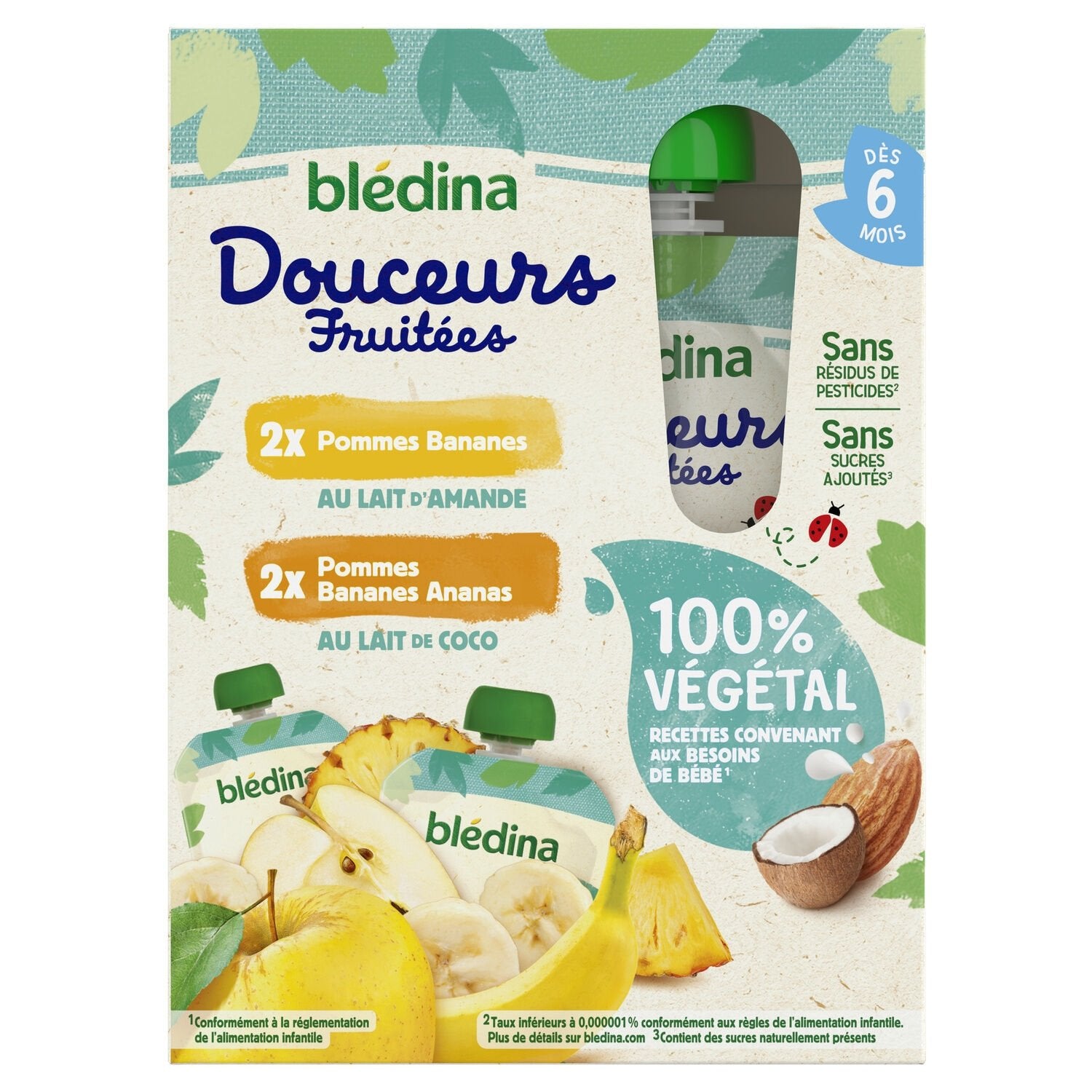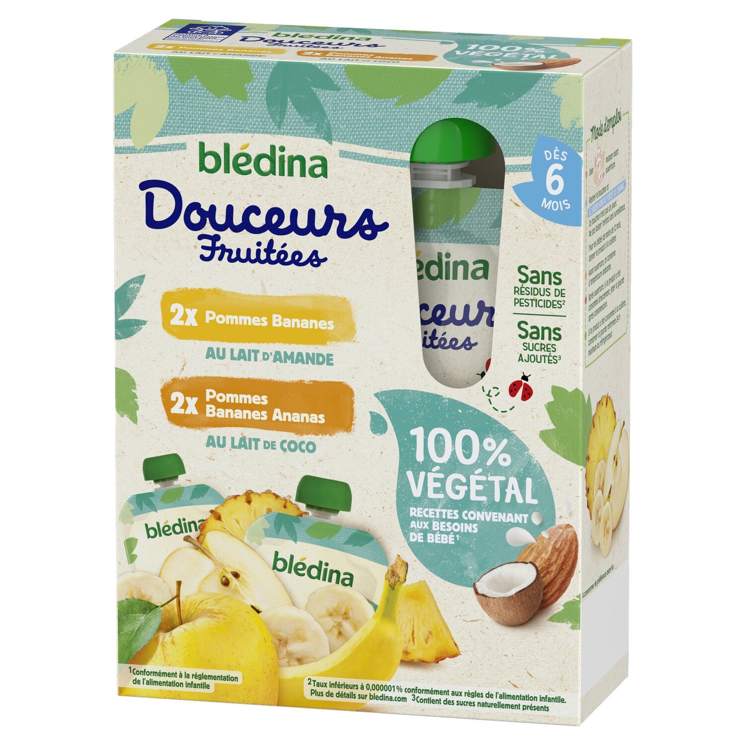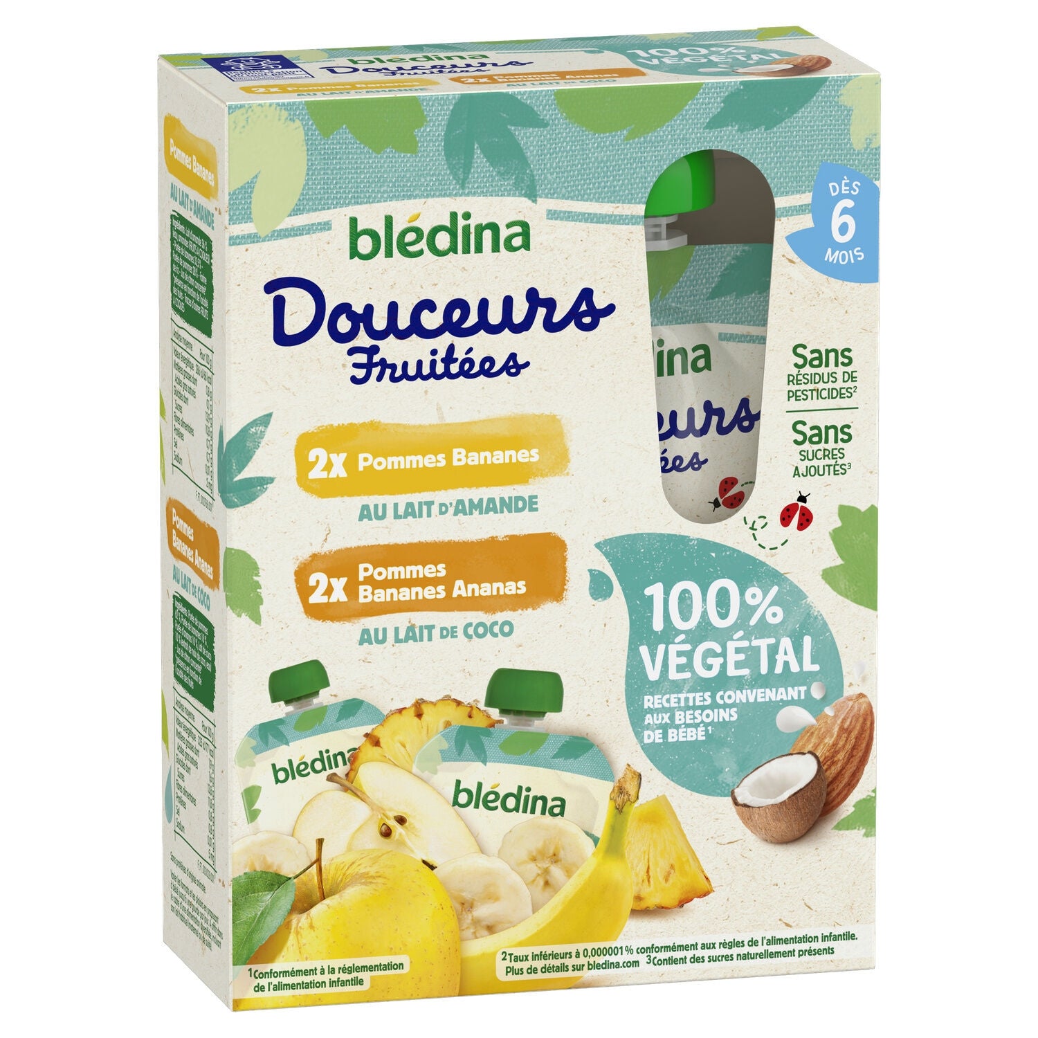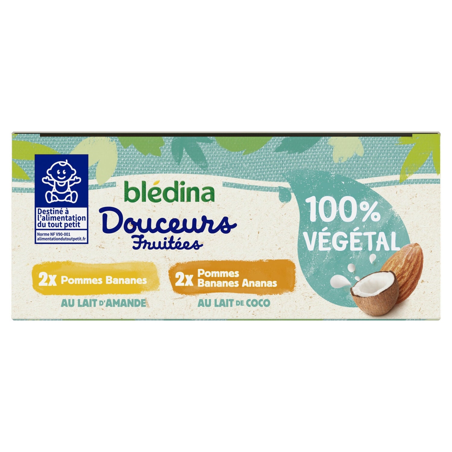 BLEDINA Fruity Sweets 100% vegetable Apples Bananas: Ingredients: Apple puree 62%, Banana puree 18%, Pineapple puree 10%, Coconut MILK 10% (coconut extract, water) - Concentrated lemon juice* *presence depending on the acidity of the fruits BLEDINA Fruity Sweets 100% vegetable Apples Bananas: Ingredients: Almond MILK 36% ((water, almonds (NUTS)) - Banana puree 33.5% - Apple puree 28% - Rice flour - Concentrated lemon juice* *presence depending on the acidity of the fruits - Traces of other NUTS