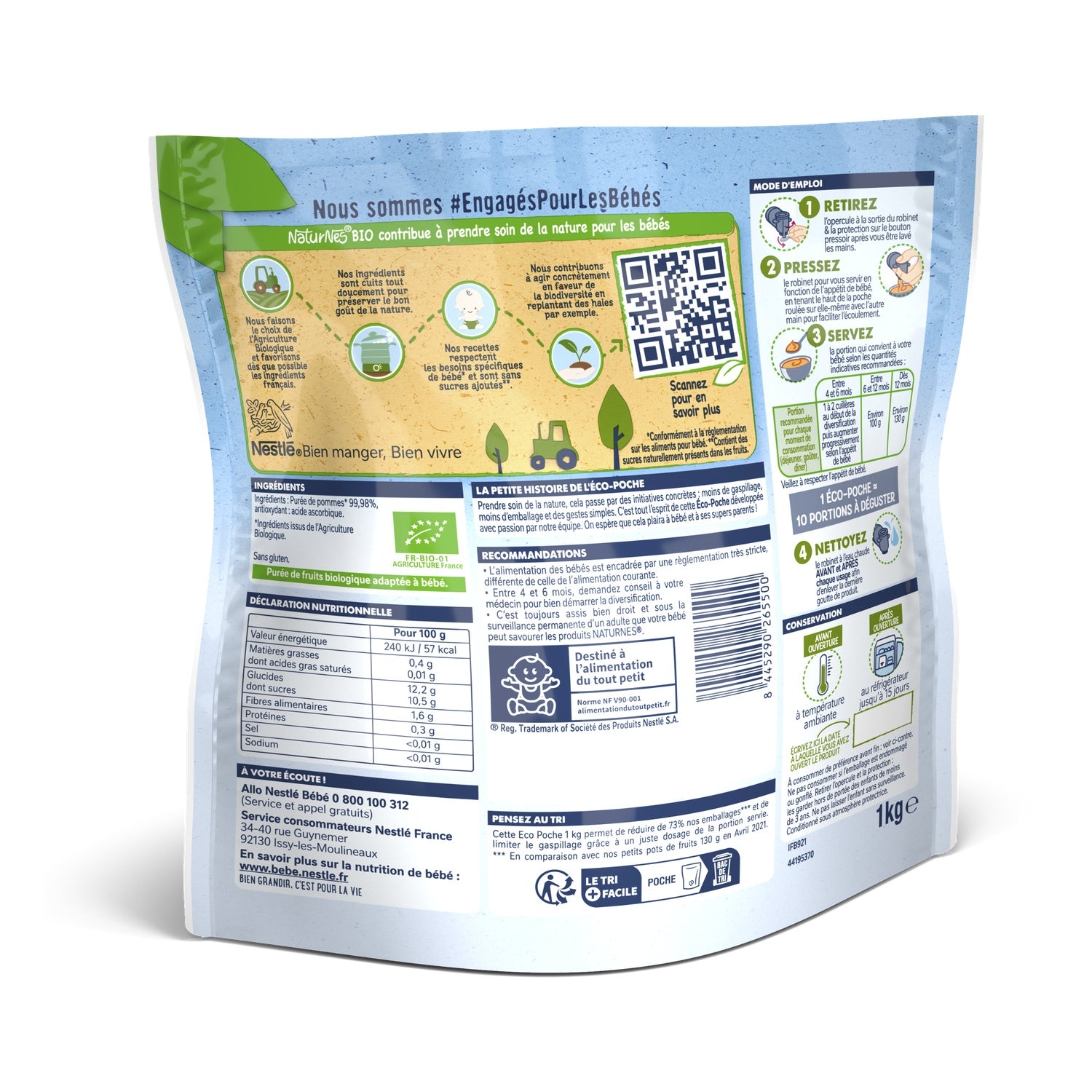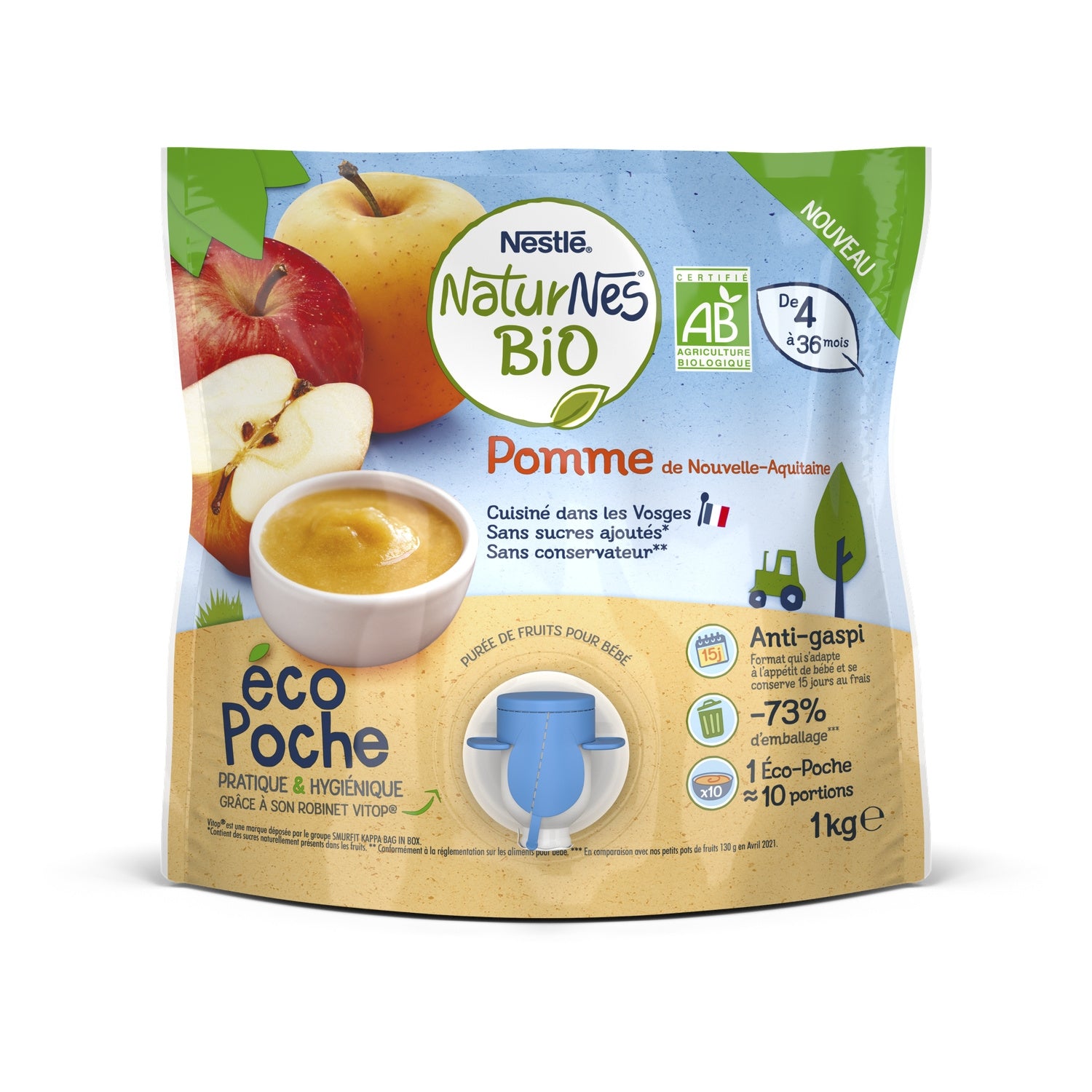 Discover our new format: the 1kg eco-pouch, which reduces our packaging by 73%* and limits waste thanks to the right dosage of the portion served. NaturNes BIO is all the expertise of NaturNes with ingredients from Organic Farming, thus helping to take care of nature for babies. Rigorously selected at maturity, our fruits are cooked very gently to preserve the good taste of nature. All our eco-pouches are made in France in the Vosges. Between 4 and 6 months, ask your doctor for advice on how to get weaning off to a good start.* Compared to our 130g fruit jars in April 2021.