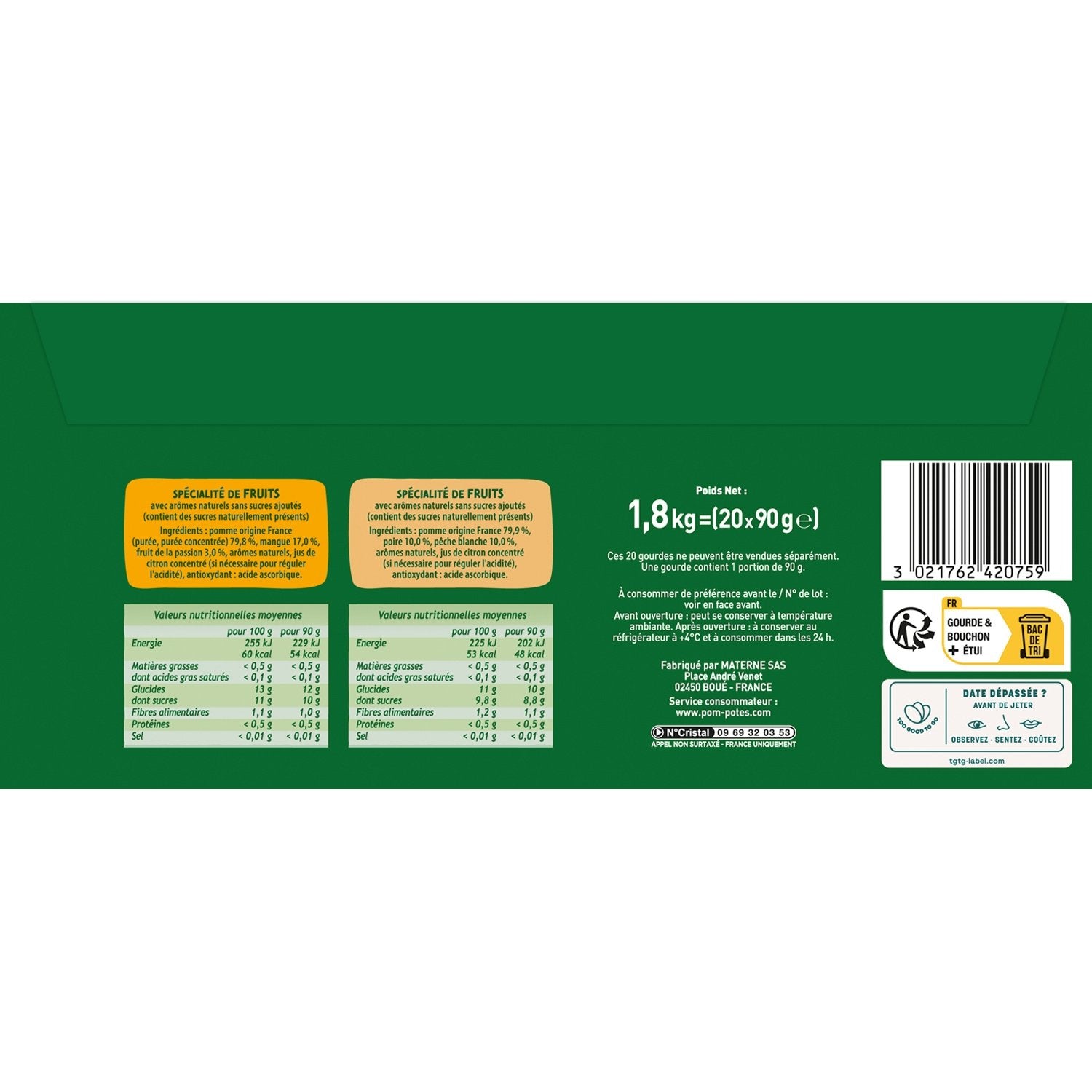 Apple Mango Passion Fruit: apple from France (puree, concentrated purée) 79.8%, mango 17.0%, passion fruit 3.0%, natural flavorings, concentrated lemon juice (if necessary to regulate acidity), antioxidant: ascorbic acid. Apple Pear White Peach: apple from France 79.9%, pear 10.0%, white peach 10.0%, natural flavorings, concentrated lemon juice (if necessary to regulate acidity), antioxidant: ascorbic acid.