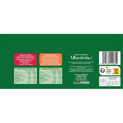 5 red fruits: apple from France (puree, concentrated purée) 79.9%, strawberry 6.0%, raspberry 5.0%, blueberry 5.0%, cherry 4.0%, natural flavoring, antioxidant: ascorbic acid. 5 orange fruits: apple from France 79.9%, mango 8.0%, peach 5.0%, apricot 4.0%, prickly pear 3.0%, natural flavoring, concentrated lemon juice (if necessary to regulate acidity), antioxidant: ascorbic acid.
