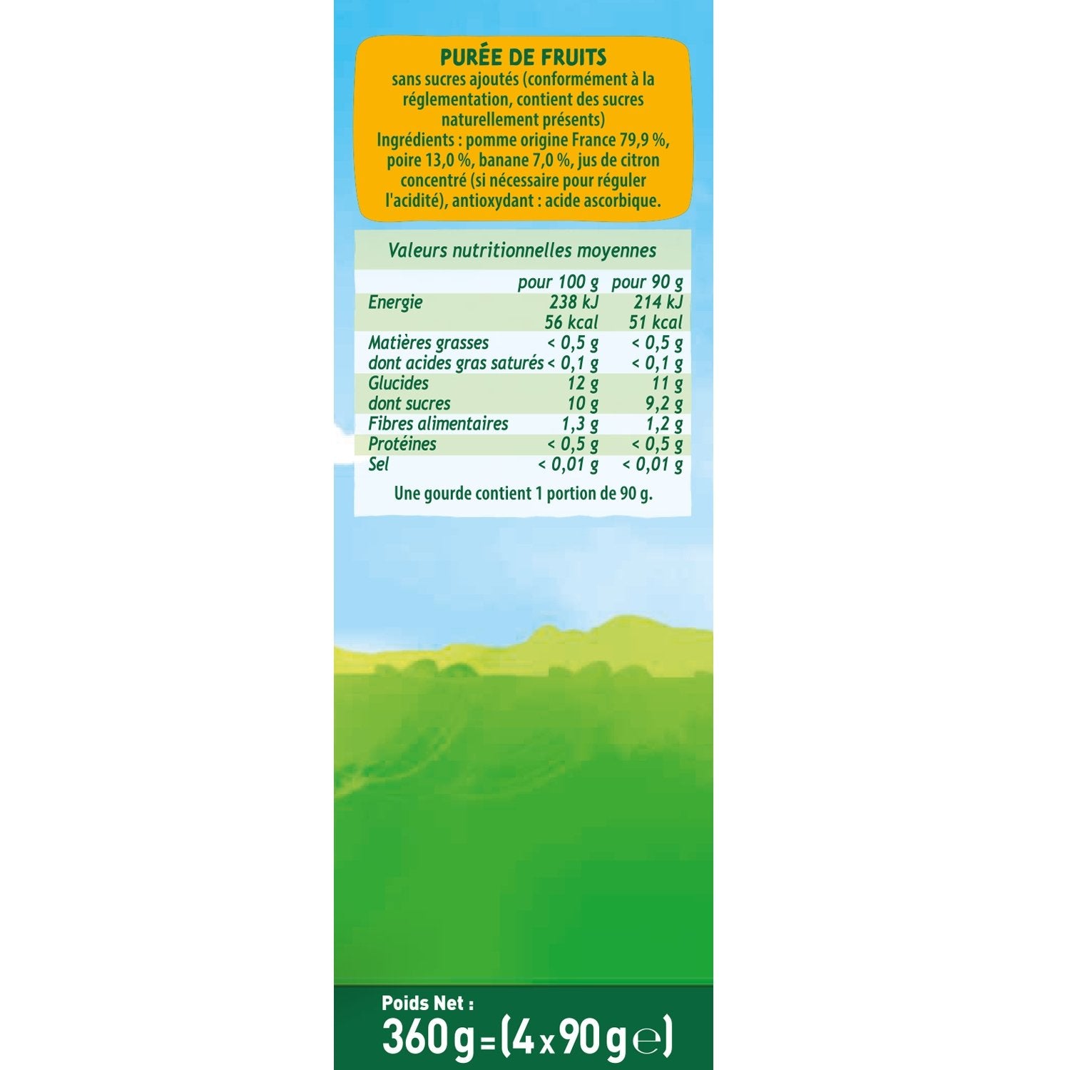 Apple from France 79.9%, pear 13.0%, banana 7.0%, concentrated lemon juice (if necessary to regulate acidity), antioxidant: ascorbic acid.