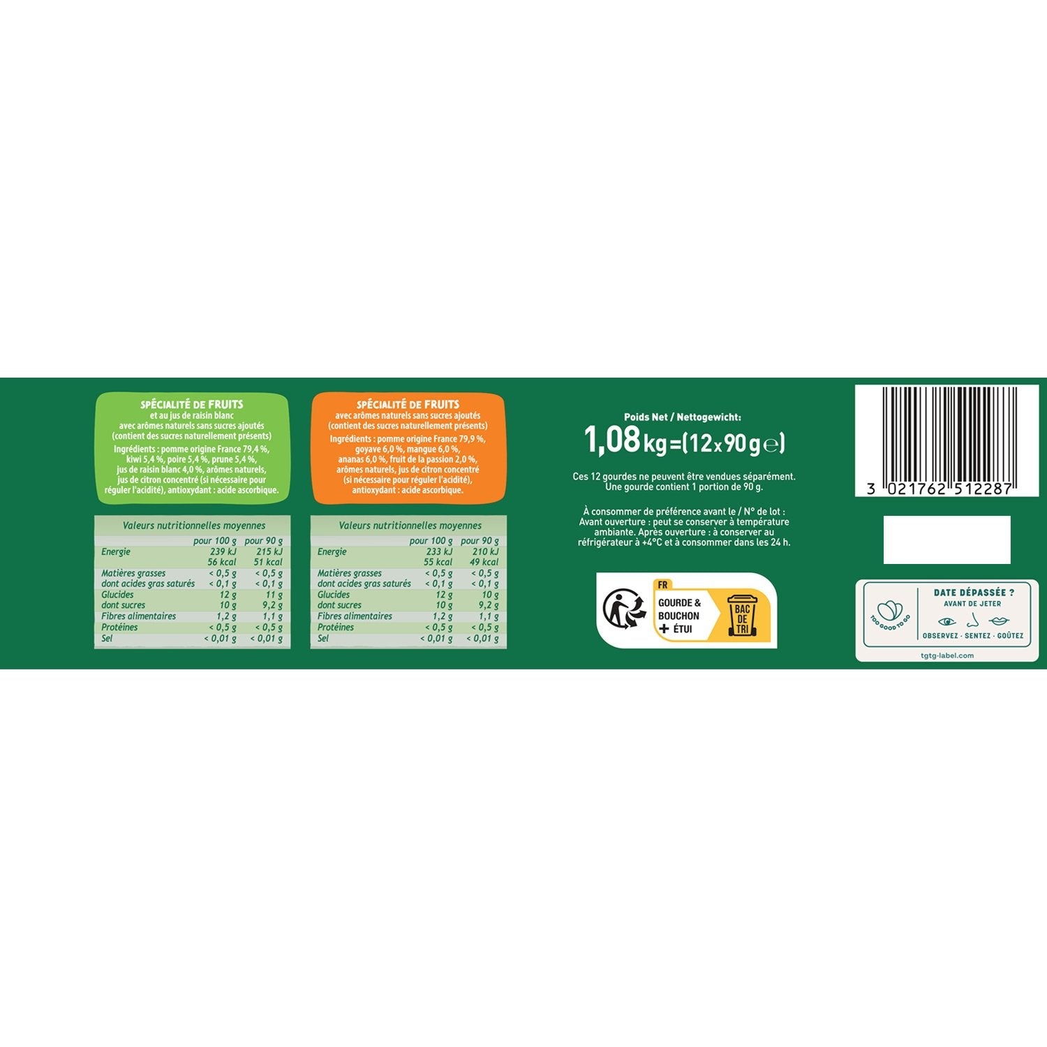 5 Exotic Fruits: apple from France 79.9%, guava 6.0%, mango 6.0%, pineapple 6.0%, passion fruit 2.0%, natural flavorings, concentrated lemon juice (if necessary to regulate acidity), antioxidant: ascorbic acid. 5 Green Fruits: apple from France 79.5%, kiwi 5.4%, pear 5.4%, plum 5.4%, grape juice 4.0%, natural flavorings, concentrated lemon juice (if necessary to regulate acidity), antioxidant: ascorbic acid.
