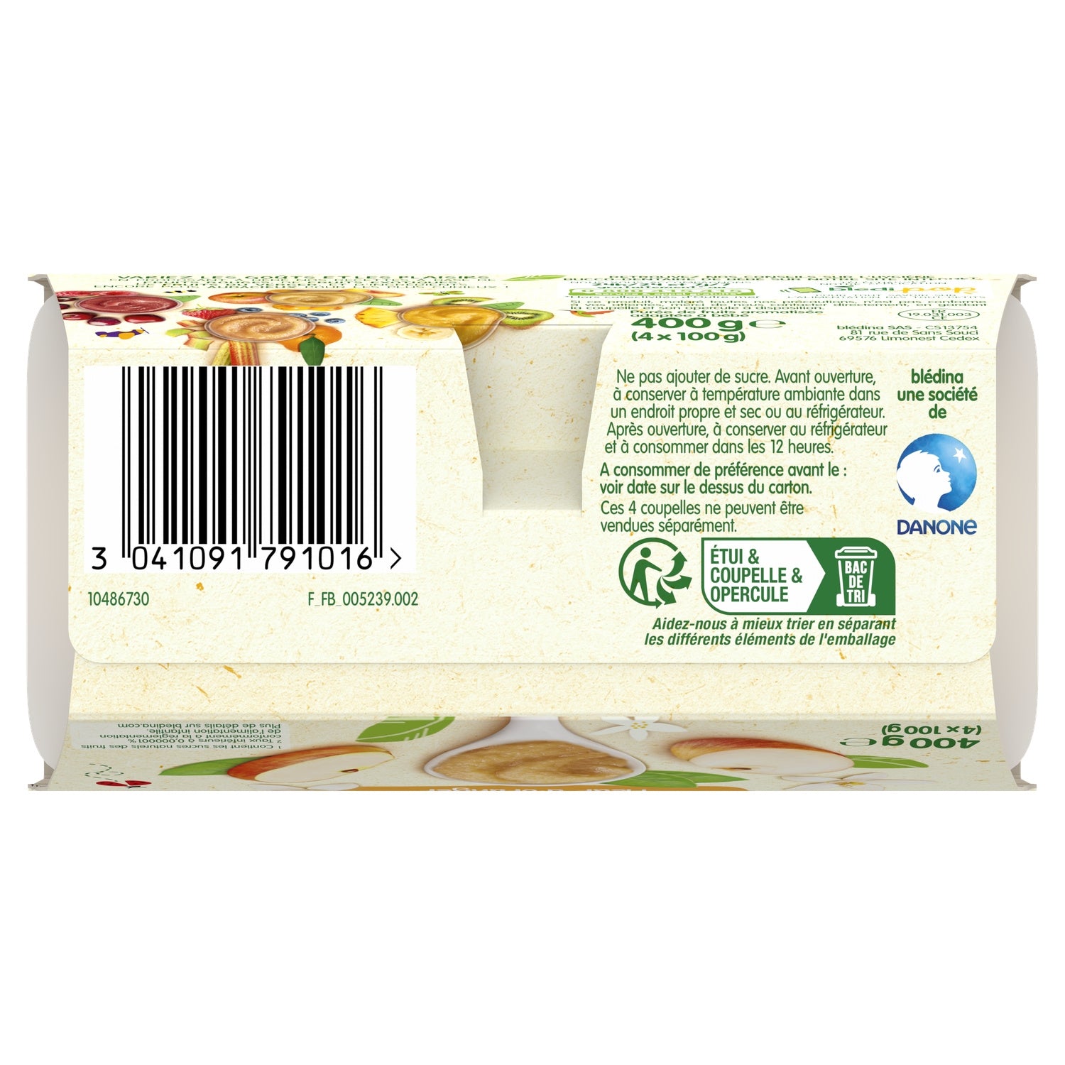 No added sugars: contains natural fruit sugars.,No pesticide residues: levels below 0.000001%, in accordance with infant nutrition regulations. More details on bledina.com.,More than 15 fruit puree recipes to discover, developed by our nutritionists and cooked in France in Brive la Gaillarde and perfectly adapted to baby's age (in accordance with infant nutrition regulations).