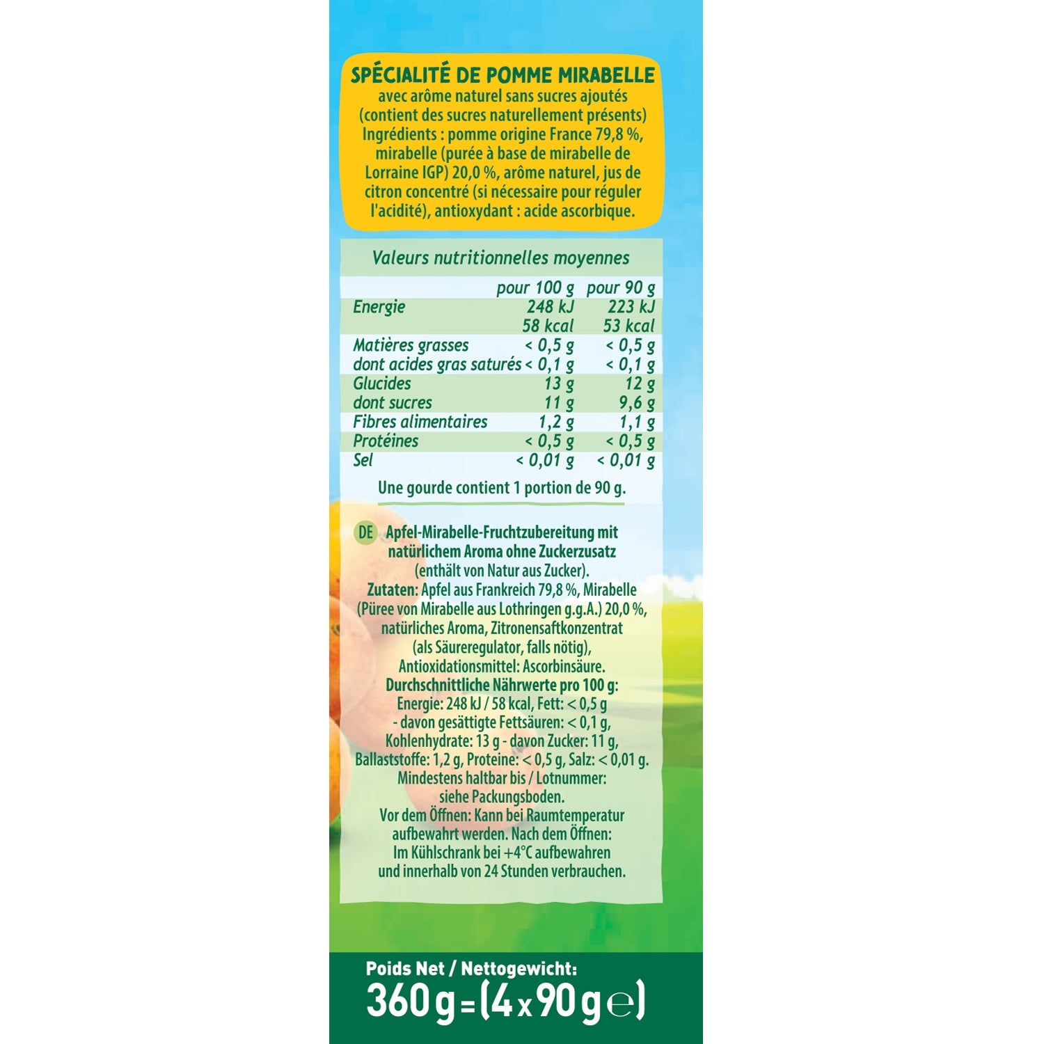 Apple from France 79.8%, mirabelle plum 20.0% (purée made from Lorraine mirabelle plum PGI), natural flavoring, concentrated lemon juice (if necessary to regulate acidity), antioxidant: ascorbic acid.