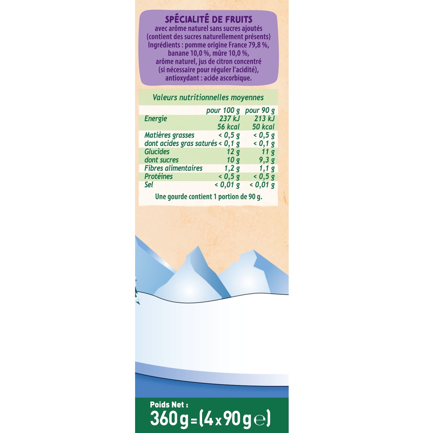 Apple from France 79.8%, banana 10.0%, blackberry 10.0%, natural flavoring, concentrated lemon juice (if necessary to regulate acidity), antioxidant: ascorbic acid.