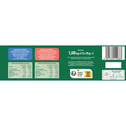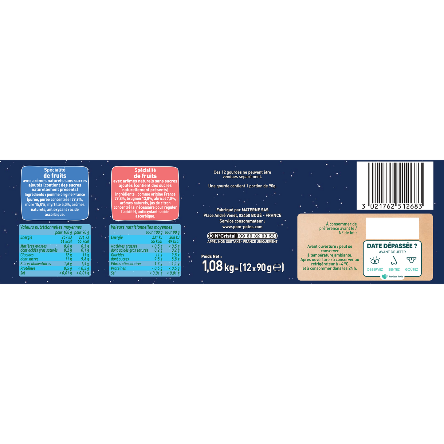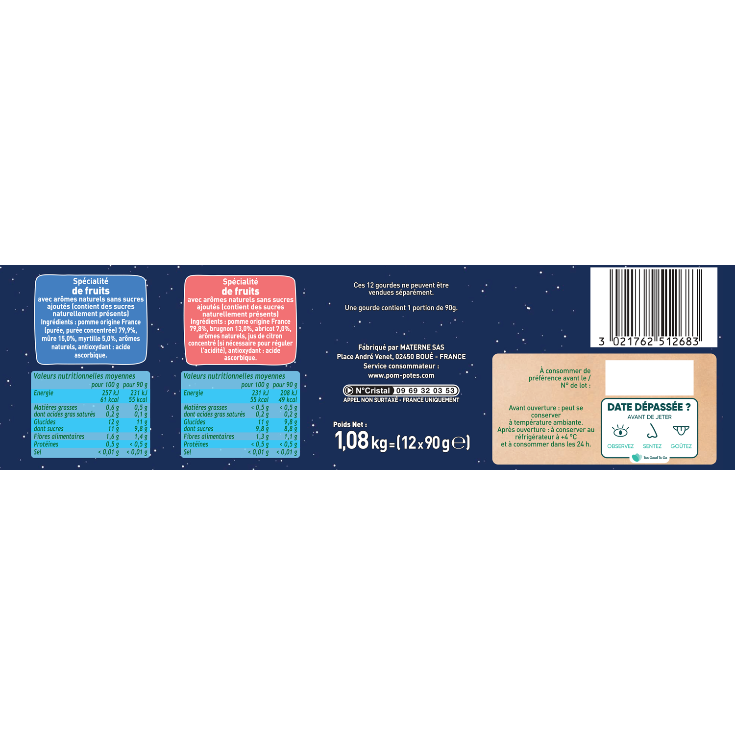Apple Blackberry Blueberry: apple from France (puree, concentrated purée) 79.9%, blackberry 15.0%, blueberry 5.0%, natural flavorings, antioxidant: ascorbic acid. Apple Apricot Brugnon: apple from France 79.8%, nectarine 13.0%, apricot 7.0%, natural flavorings, concentrated lemon juice (if necessary to regulate acidity), antioxidant: ascorbic acid.