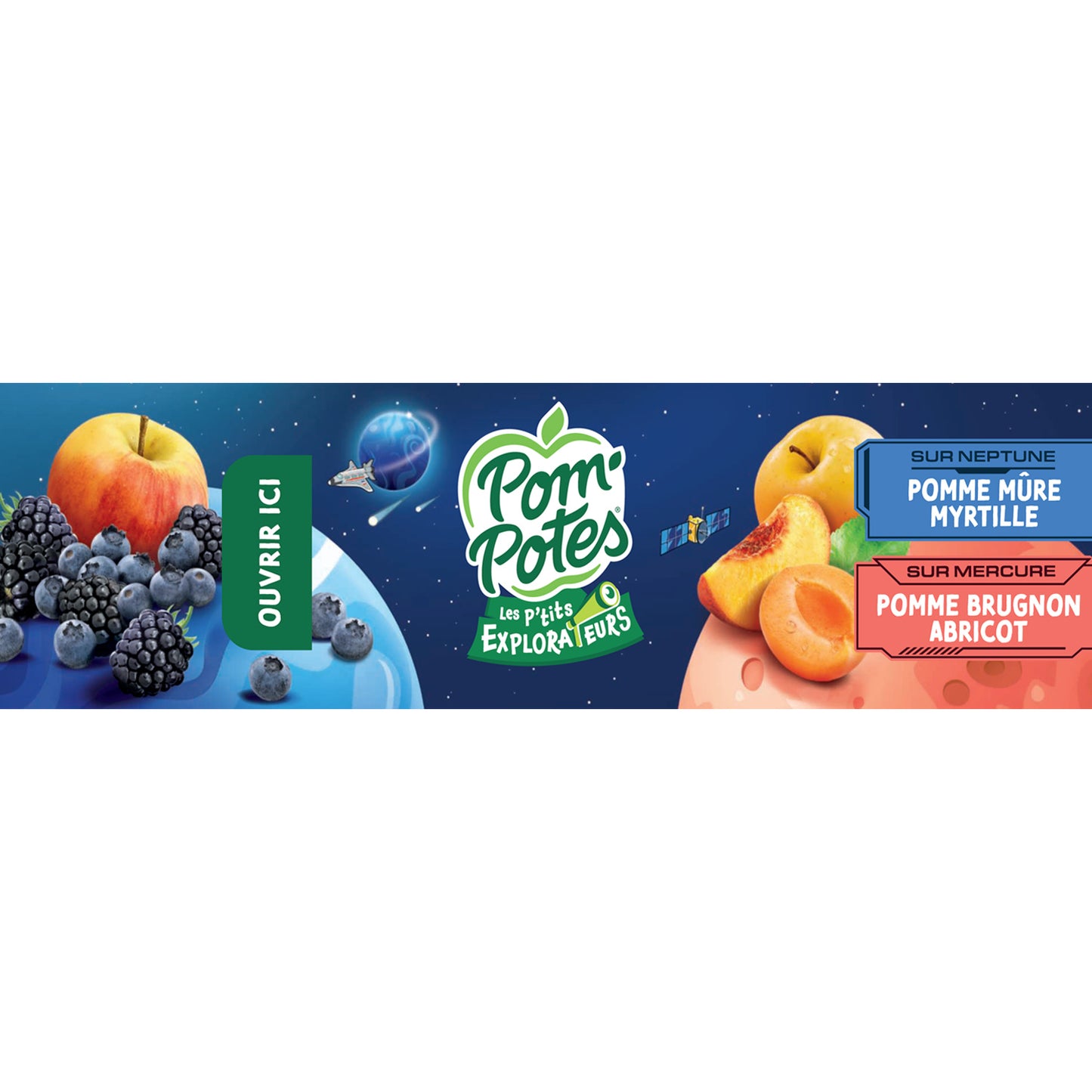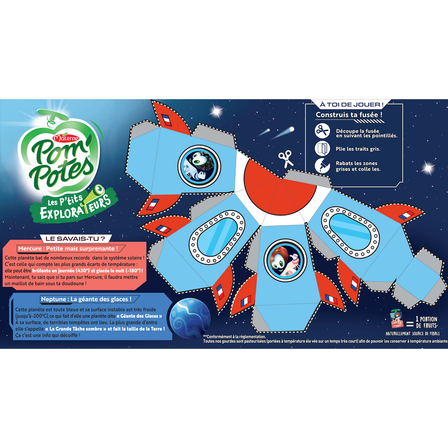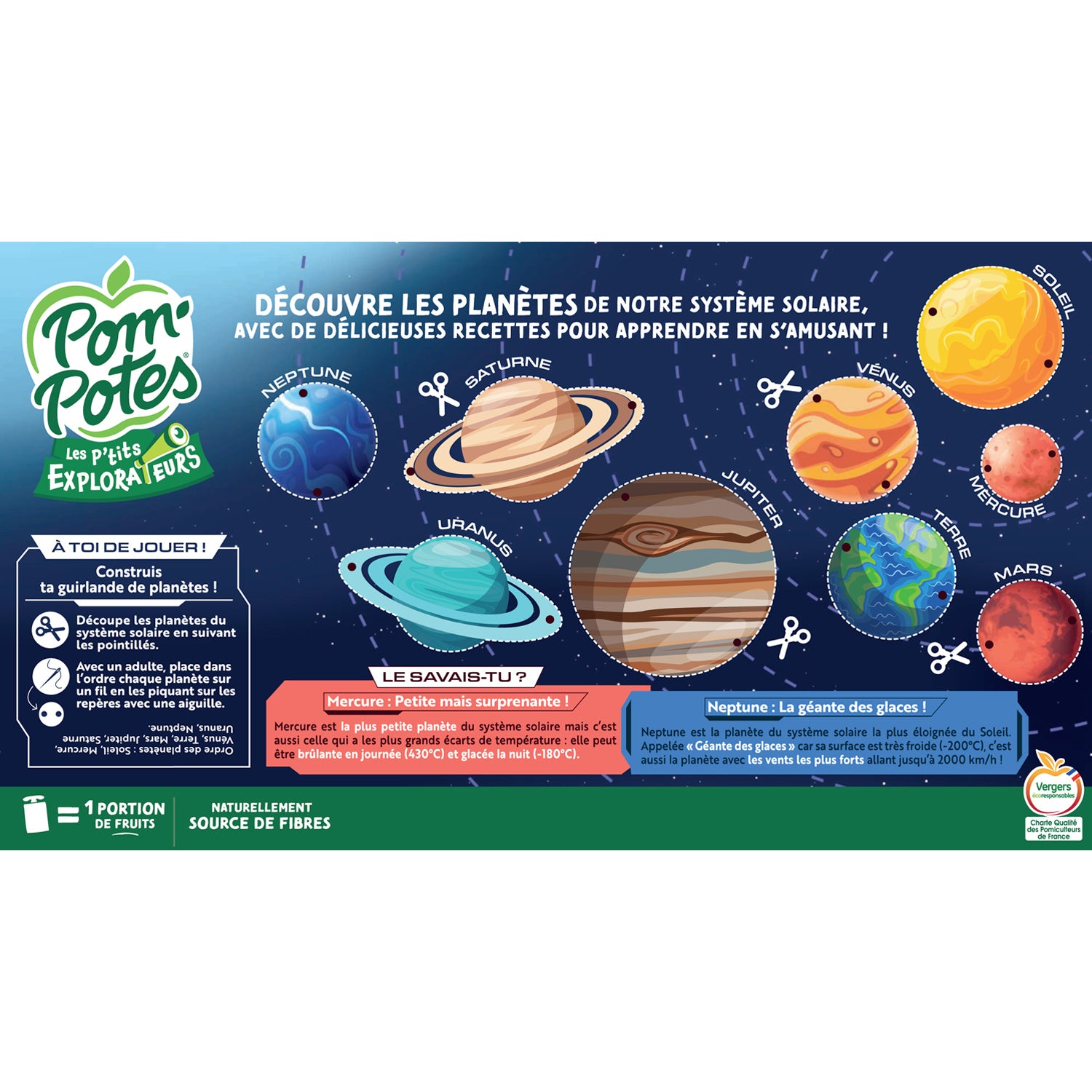 Discover Pom'Potes® Les P'tits Explorateurs dans l'espace, a fun and educational range of compotes in pouches that will awaken your children's curiosity with: - Gourmet recipes with fruits the same color as the planets in the solar system - Fun and educational packaging: an exploration of space through fun games and anecdotes Pom'Potes® Les P'tits Explorateurs also offers: • Recipes with no added sugars* • Nutri-Score A • A Pom'Potes® pouch corresponds to 1 of the 5 portions of fruits and vegetables recommended daily * Contains naturally occurring sugars