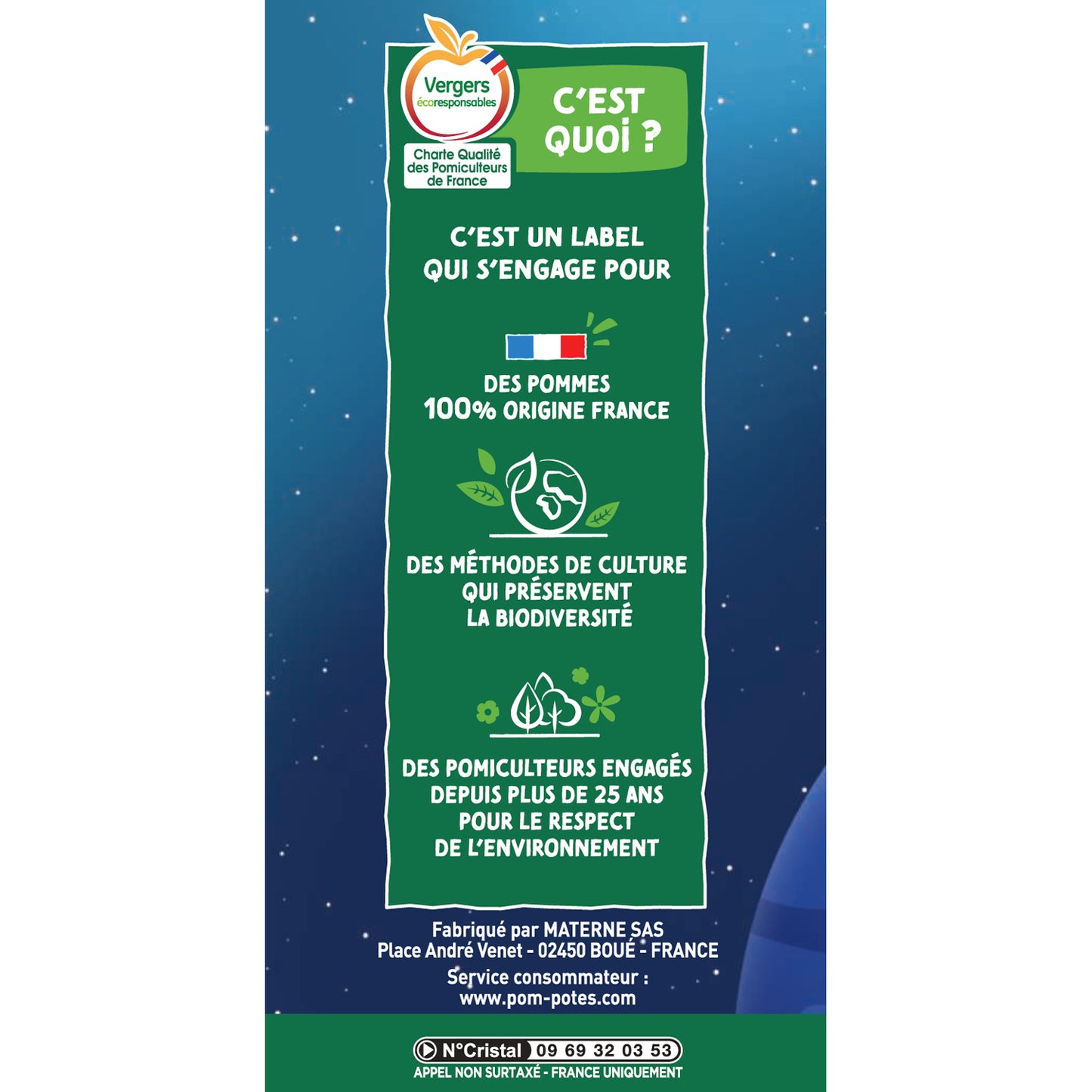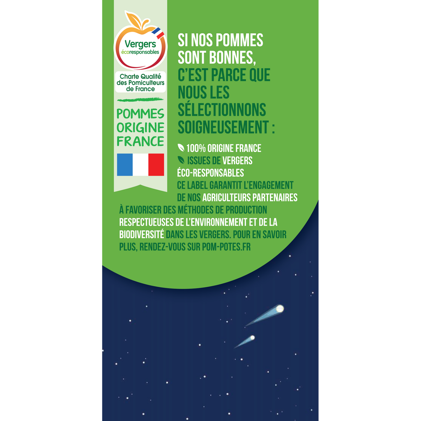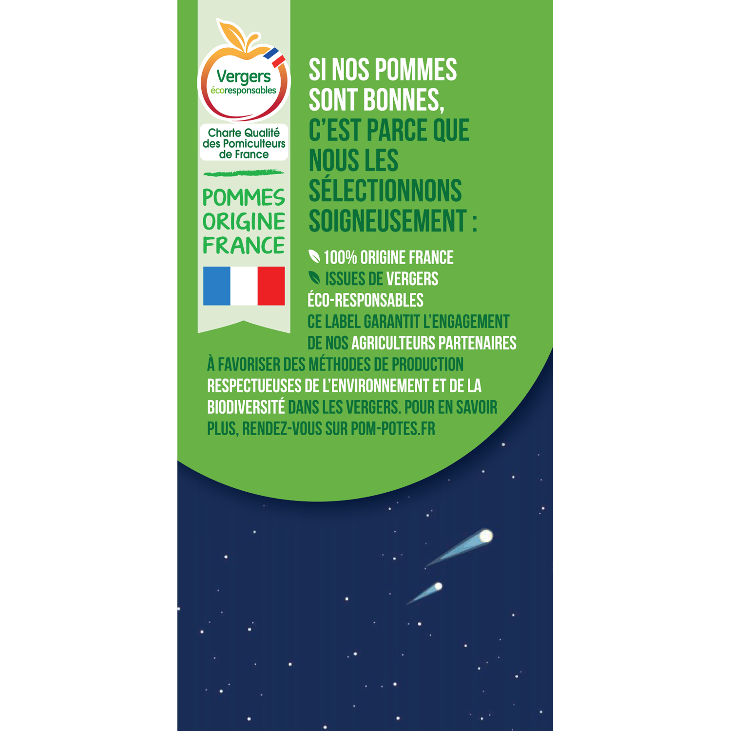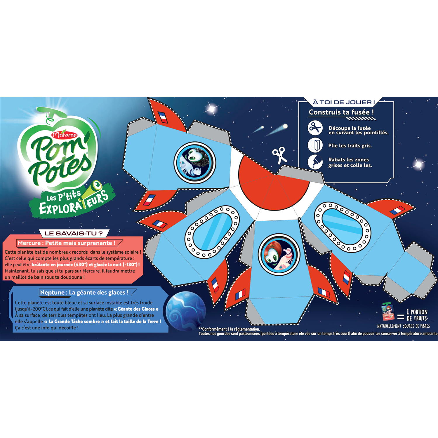 Discover Pom'Potes® Les P'tits Explorateurs dans l'espace, a fun and educational range of compotes in pouches that will awaken your children's curiosity with: - Gourmet recipes with fruits the same color as the planets in the solar system - Fun and educational packaging: an exploration of space through fun games and anecdotes Pom'Potes® Les P'tits Explorateurs also offers: • Recipes with no added sugars* • Nutri-Score A • A Pom'Potes® pouch corresponds to 1 of the 5 portions of fruits and vegetables recommended daily * Contains naturally occurring sugars