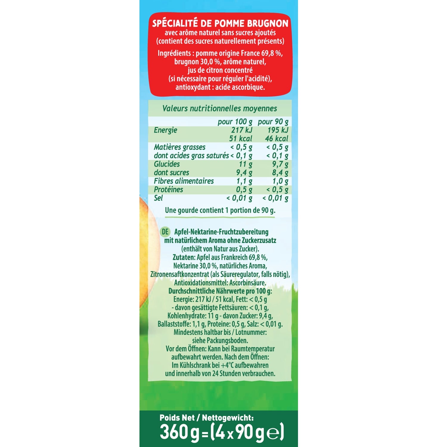 Apple from France 69.8%, nectarine 30.0%, natural flavoring, concentrated lemon juice (if necessary to regulate acidity), antioxidant: ascorbic acid.