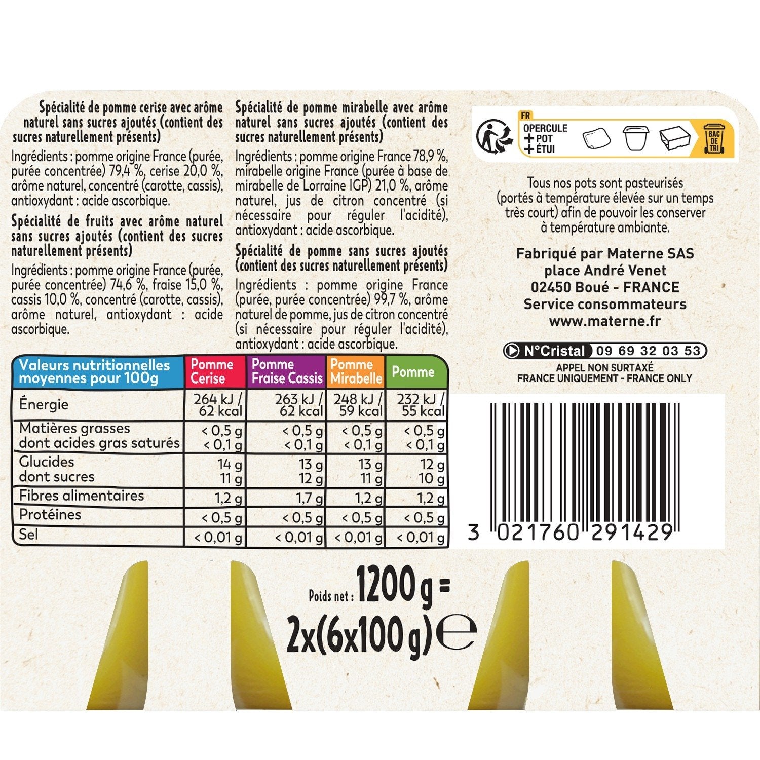 Apple: apple from France (puree; concentrated purée) 99.7%; natural apple flavoring; concentrated lemon juice (if necessary to regulate acidity); antioxidant: ascorbic acid. Apple Cherry: apple from France (puree; concentrated purée) 79.4%; cherry 20.0%; natural flavoring; concentrate (carrot; blackcurrant); antioxidant: ascorbic acid. Apple Mirabelle: apple from France 78.9%; mirabelle plum 21.0% (puree made from Mirabelle de Lorraine PGI); natural flavoring; concentrated lemon juice (if necessary to regulate acidity); antioxidant: ascorbic acid. Apple Strawberry Blackcurrant: apple from France (puree; concentrated purée) 74.6%; strawberry 15.0%; blackcurrant 10.0%; natural flavoring; concentrate (carrot; blackcurrant); antioxidant: ascorbic acid.