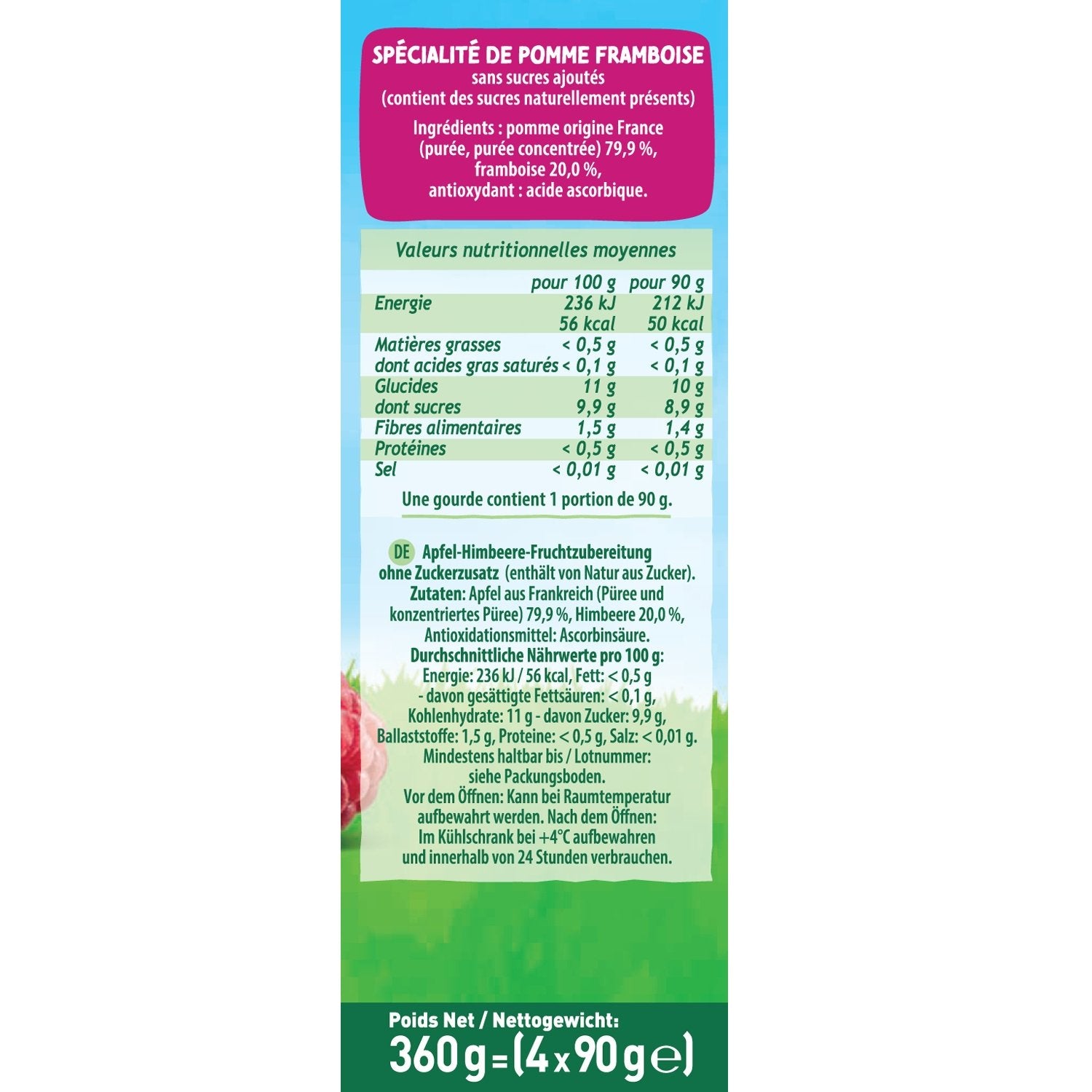 Apple from France 79.9% (puree and concentrated purée), raspberry 20.0%, antioxidant: ascorbic acid.