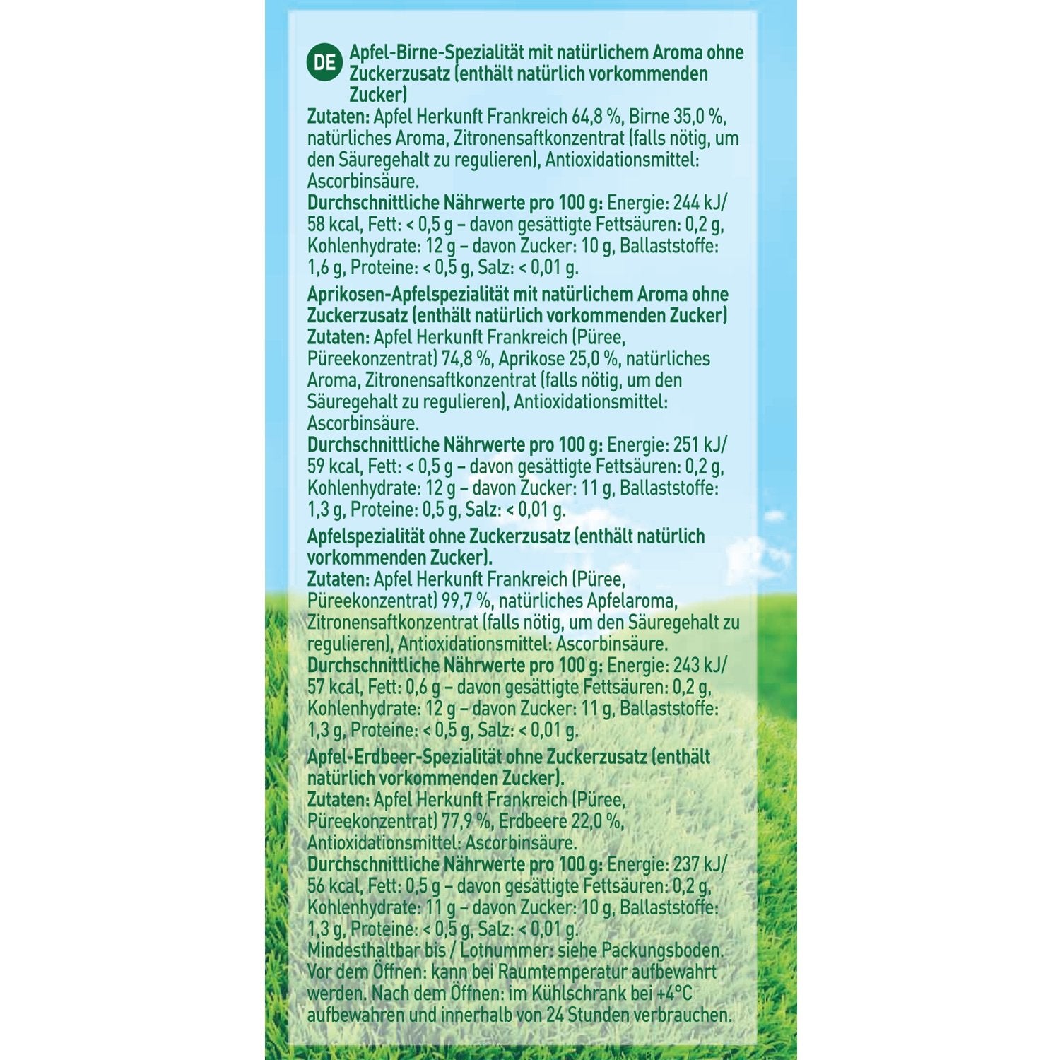 APPLE: apple from France (puree, concentrated puree) 99.7%, natural apple flavoring, concentrated lemon juice (if necessary to regulate acidity), antioxidant: ascorbic acid. APPLE STRAWBERRY: apple from France (puree, concentrated puree) 77.9%, strawberry 22.0%, antioxidant: ascorbic acid. APPLE PEAR: apple from France 64.8%, pear 35.0%, natural flavoring, concentrated lemon juice (if necessary to regulate acidity), antioxidant: ascorbic acid. APPLE APRICOT: apple from France (puree, concentrated puree) 74.8%, apricot 25.0%, natural flavoring, concentrated lemon juice (if necessary to regulate acidity), antioxidant: ascorbic acid.