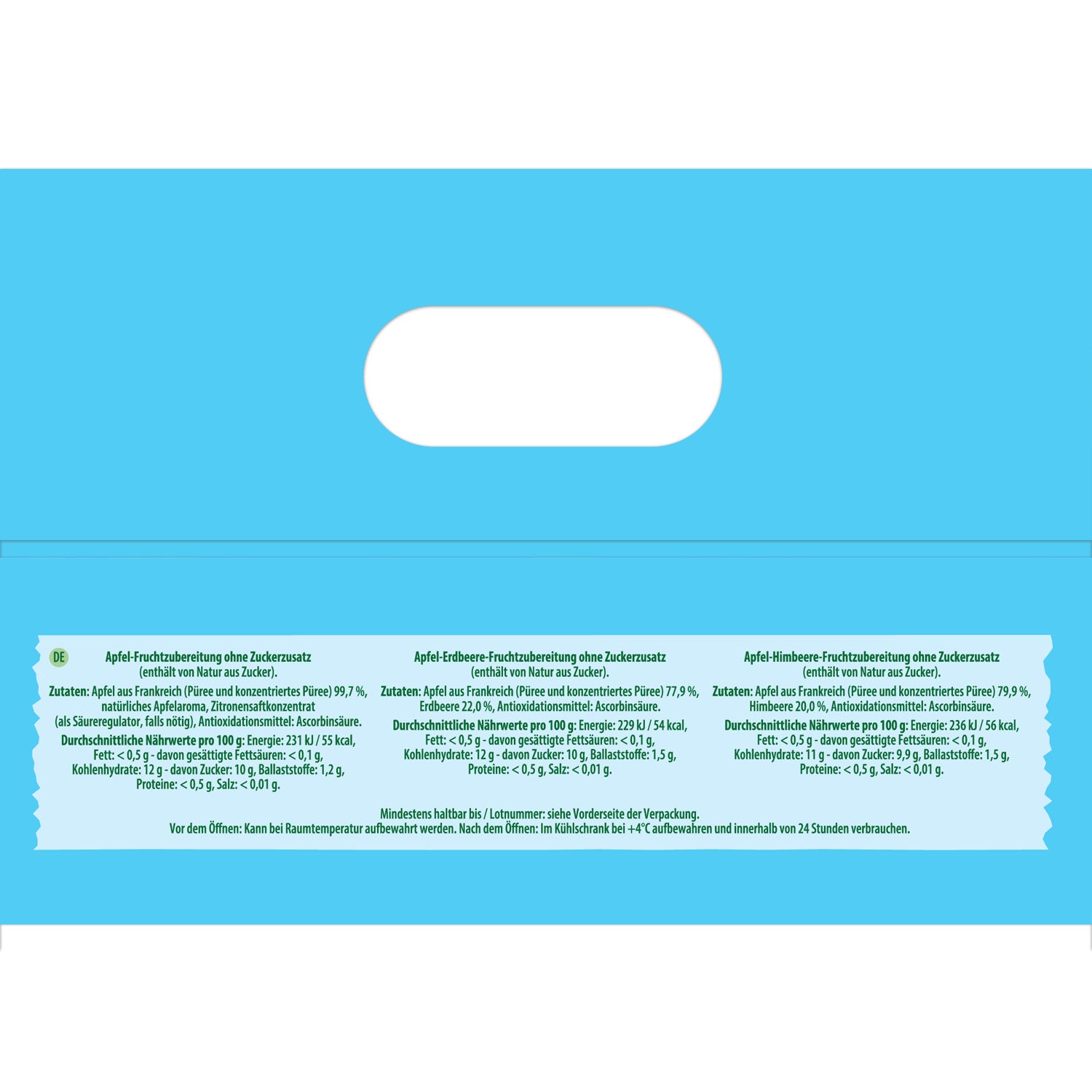 Apple: apple from France 99.7% (puree and concentrated purée), natural apple flavoring, concentrated lemon juice (if necessary to regulate acidity), antioxidant: ascorbic acid. Apple Strawberry: apple from France 77.9% (puree and concentrated purée), strawberry 22.0%, antioxidant: ascorbic acid. Apple Raspberry: apple from France 79.9% (puree and concentrated purée), raspberry 20.0%, antioxidant: ascorbic acid.