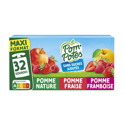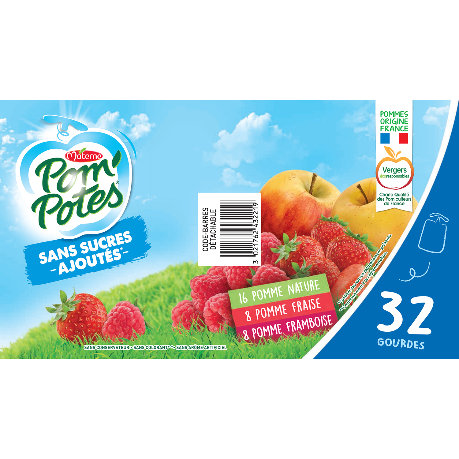 POM'POTES® No Added Sugar* is the snack you can take anywhere, made with French apples from eco-responsible orchards. At POM'POTES®, we're committed to the well-being and pleasure of young and old alike! Each of our pouches has no added sugar* and corresponds to 1 of the 5 recommended daily portions of fruit and vegetables. *Contains naturally occurring sugars.