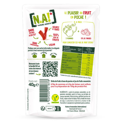 Concentrated apple puree, concentrated apple juice, strawberry puree, concentrated elderberry juice, citrus fiber, gelling agent (fruit pectins), natural strawberry flavoring. May contain traces of SOYA. 678g of apples and 43g of strawberries are used to prepare 100g of finished product.