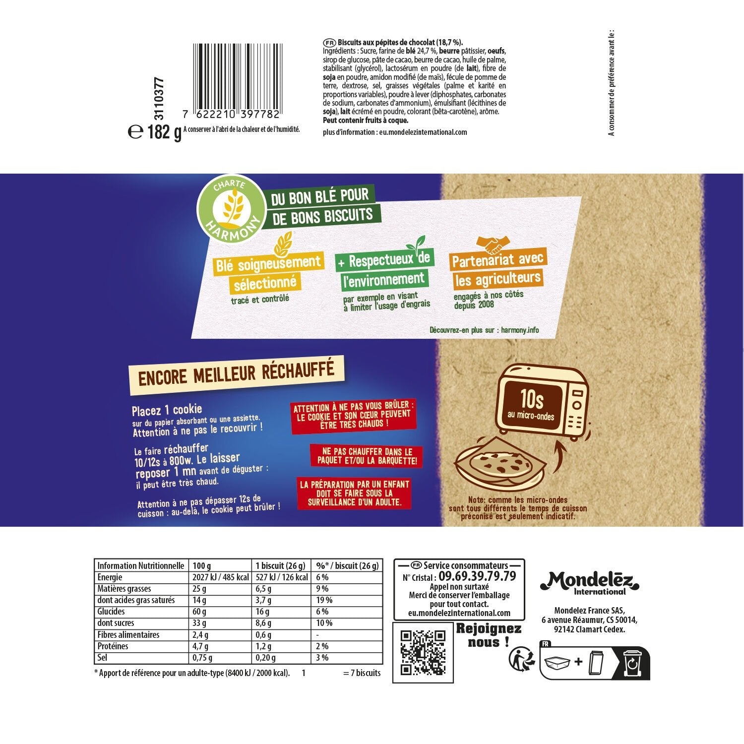 Ingredients: Sugar, WHEAT flour 24.7%, BUTTER, EGGS, glucose syrup, cocoa mass, cocoa butter, palm oil, stabilizer (glycerol), whey powder (from MILK), SOY fiber powder, modified starch (from corn), potato starch, dextrose, salt, vegetable fats (palm and shea in varying proportions), raising agents (diphosphates, sodium carbonates, ammonium carbonates), emulsifier (SOY lecithins), skimmed MILK powder, color (beta-carotene), flavoring. MAY CONTAIN NUTS.