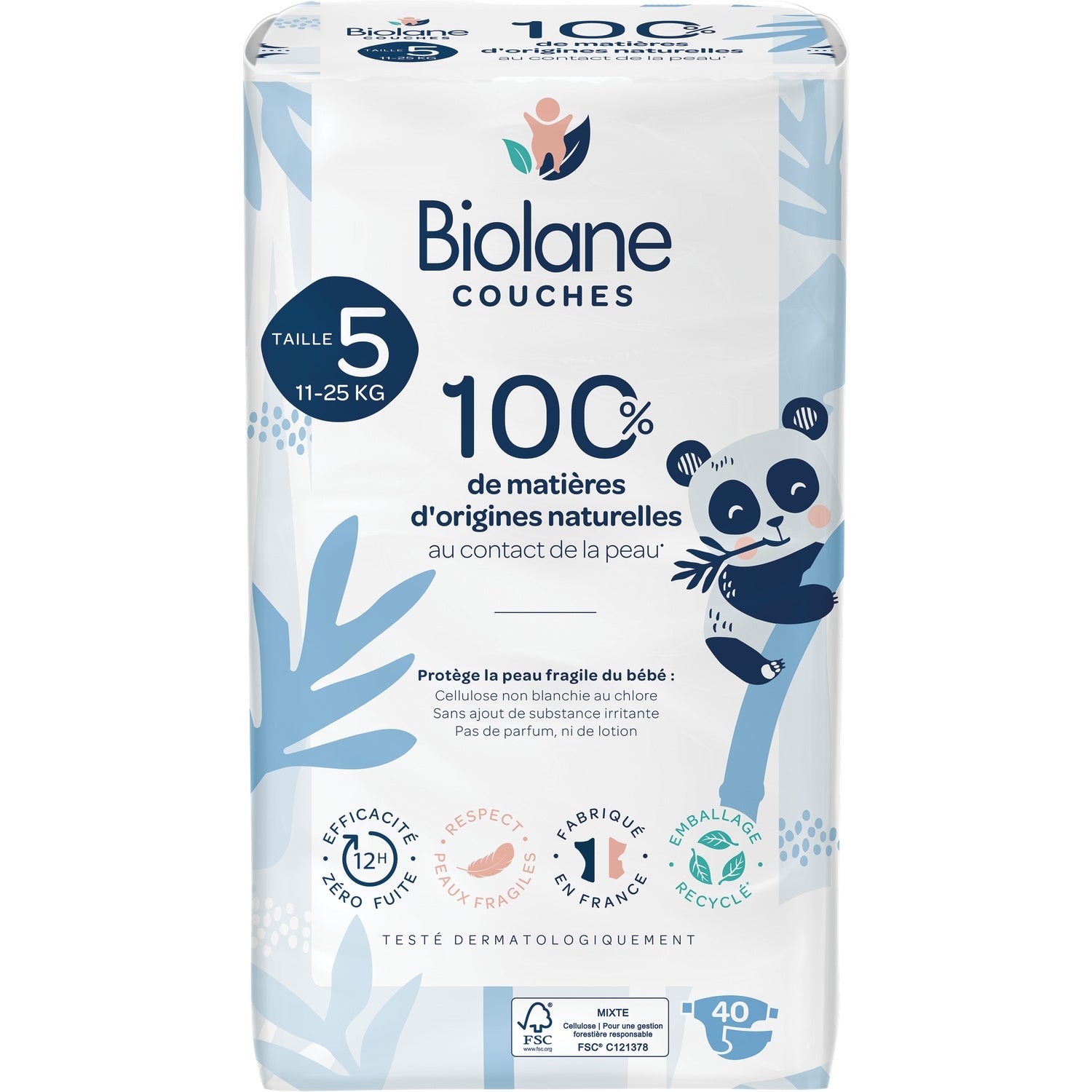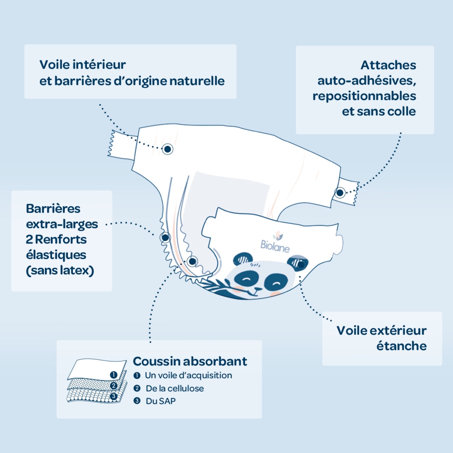 100% of the materials in contact with the skin are of natural origin Protects your baby's fragile skin: without the addition of irritating or toxic substances 12h anti-leak protection Ultra-absorbent core: acquisition layer that evenly distributes fluids Comfort guaranteed in all circumstances: ultra-soft and fluffy Diaper made from materials of natural origin designed with priority given to renewable energies Made in France Packaging made from 80% recycled materials A Biolane animal for each diaper size