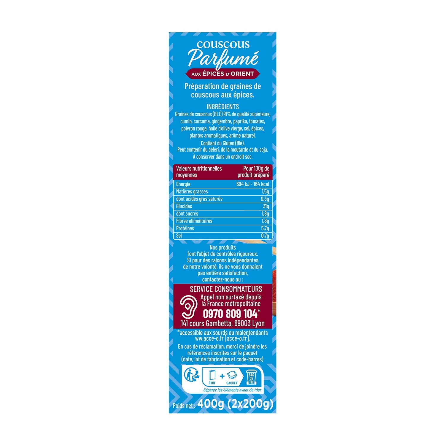 Couscous grains (WHEAT) 91% premium quality, cumin, turmeric, ginger, paprika, tomatoes, red pepper, virgin olive oil, salt, spices, aromatic plants, natural flavoring. Contains GLUTEN. May contain CELERY, SOY and MUSTARD.