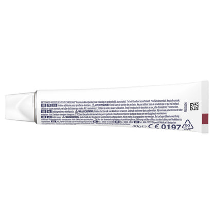 Premium adhesive cream for full and partial dentures, Precision tip for precise application, Helps prevent small food residues from slipping under the denture, Strong hold adhesive cream, Its flavorless formula does not affect the taste of food