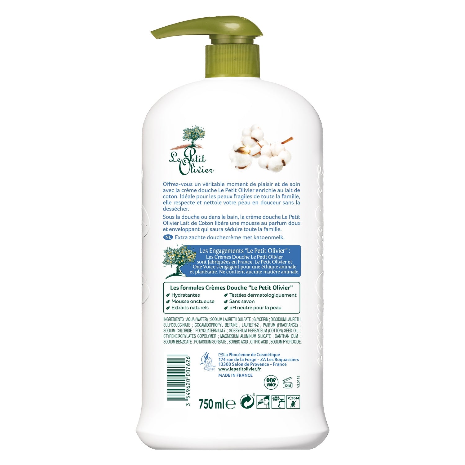 Treat yourself to a truly pampering moment with Le Petit Olivier shower cream enriched with Cotton Milk. Ideal for the whole family's delicate skin*, it gently cleanses and respects your skin without drying it out. In the shower or bath, Le Petit Olivier shower cream with Cotton Milk releases a lather with a soft, enveloping fragrance that will delight the whole family. *Children from 3 years old. This generously sized shower cream with its creamy lather gently cleanses and moisturizes the skin.