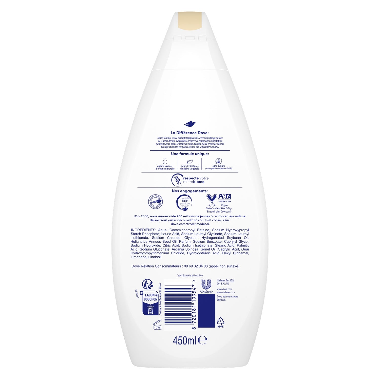 Dove Extra Rich Argan Oil Shower Cream, 450ml, has been specially designed for dry skin.,Our unique ultra-hydrating formula, with its Triple Hydration Serum and enriched with argan oil, protects and nourishes dry skin, from the first shower.,Dermatologically tested, Dove Extra Rich Argan Oil Shower Cream is kind to your microbiome and leaves you with soft and moisturized skin.,Composed of natural-origin cleansing agents and a plant-derived moisturizing active ingredient, the formula of this shower cream is 97% biodegradable and suitable for daily hygiene.,Its creamy texture transforms on the skin into a rich lather for a real moment of well-being in the shower or bath.,The bottle and cap of this shower product are recyclable and made from 100% recycled plastic.