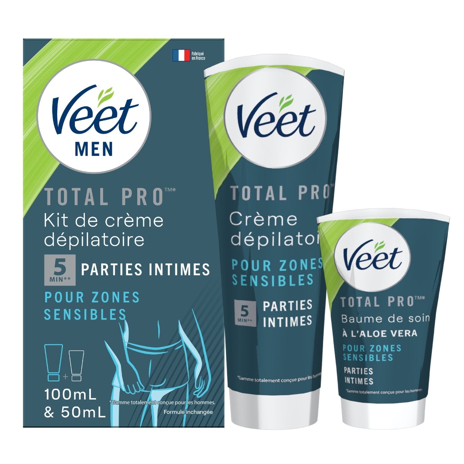 VEET MEN hair removal kit specially designed for intimate areas: includes a hair removal cream and a treatment balm.