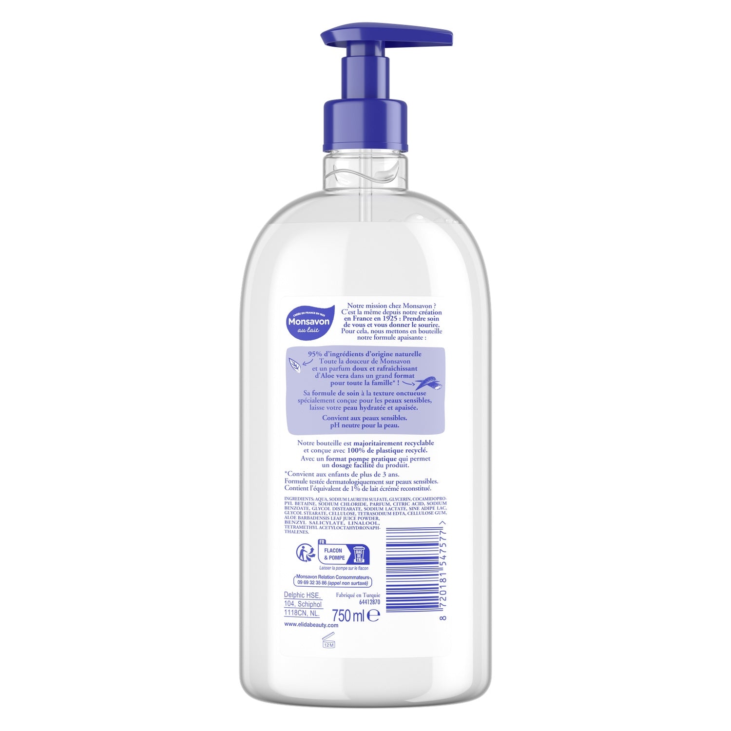 Discover Monsavon aloe vera shower gel, soothing and kind to your skin. Its creamy formula is specially designed for sensitive skin. It leaves your skin moisturized, soothed, and enveloped in a fresh fragrance. Dermatologically tested, it is suitable for sensitive skin and has a neutral pH that preserves your skin's natural balance. Our maxi-size bottle is made from 100% recycled plastic. This shower gel is equipped with a practical pump for easy dosing. Suitable for children over 3 years old. Monsavon takes care of the whole family! Size: 750 mL Also available in four other variants: Authentic, Comforting, Nourishing, and Moisturizing.