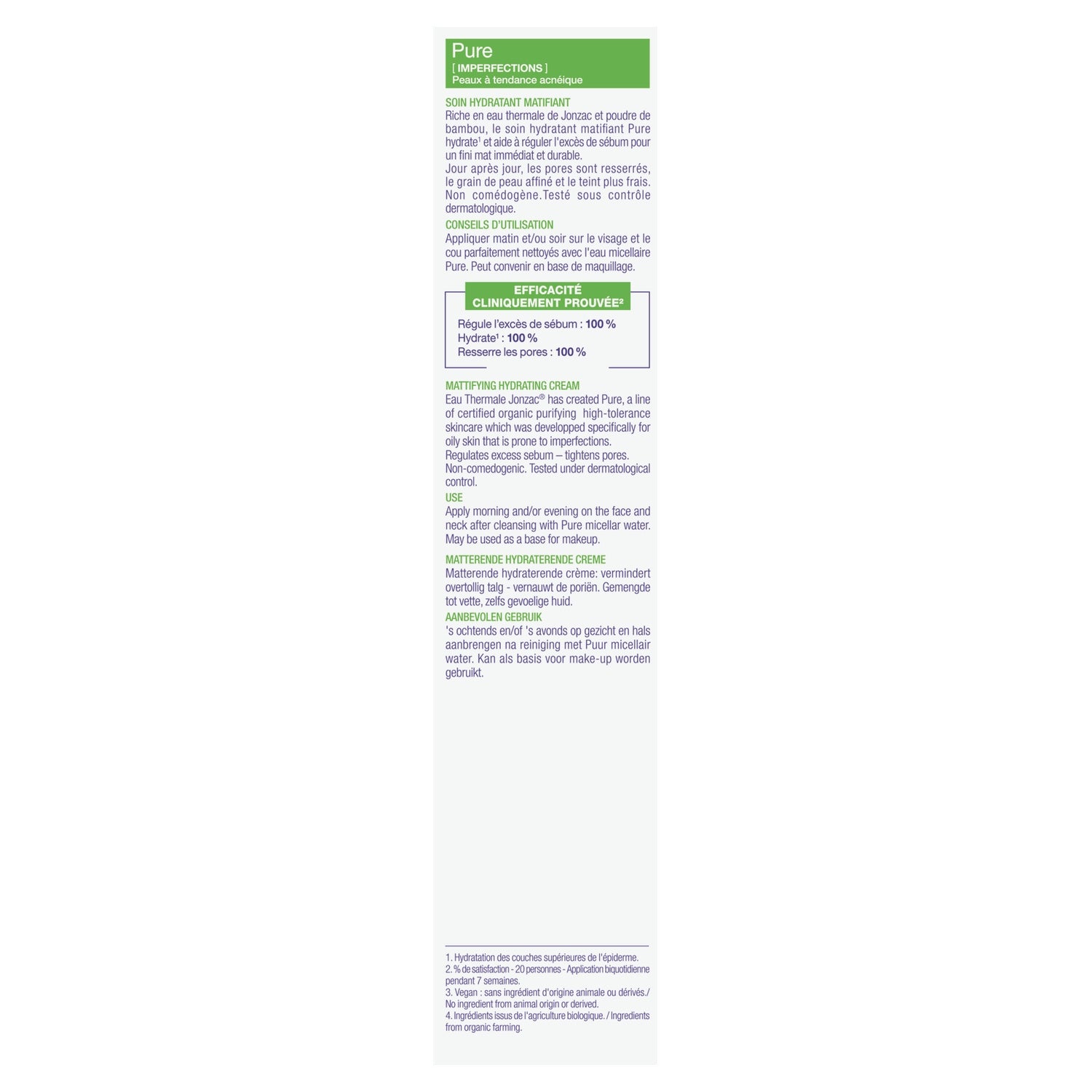 Pure IMPERFECTIONS Acne-prone skin MATTIFYING MOISTURIZING TREATMENT Rich in Jonzac thermal water and bamboo powder, Pure mattifying moisturizing treatment hydrates1 and helps regulate excess sebum for an immediate and long-lasting matte finish. Day after day, pores are tightened, skin texture is refined, and the complexion is fresher. Non-comedogenic. Dermatologically tested.