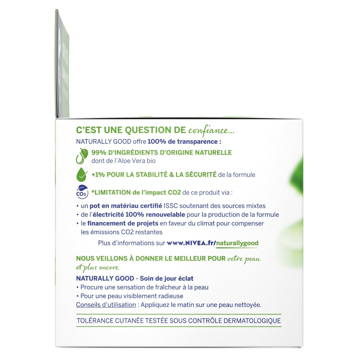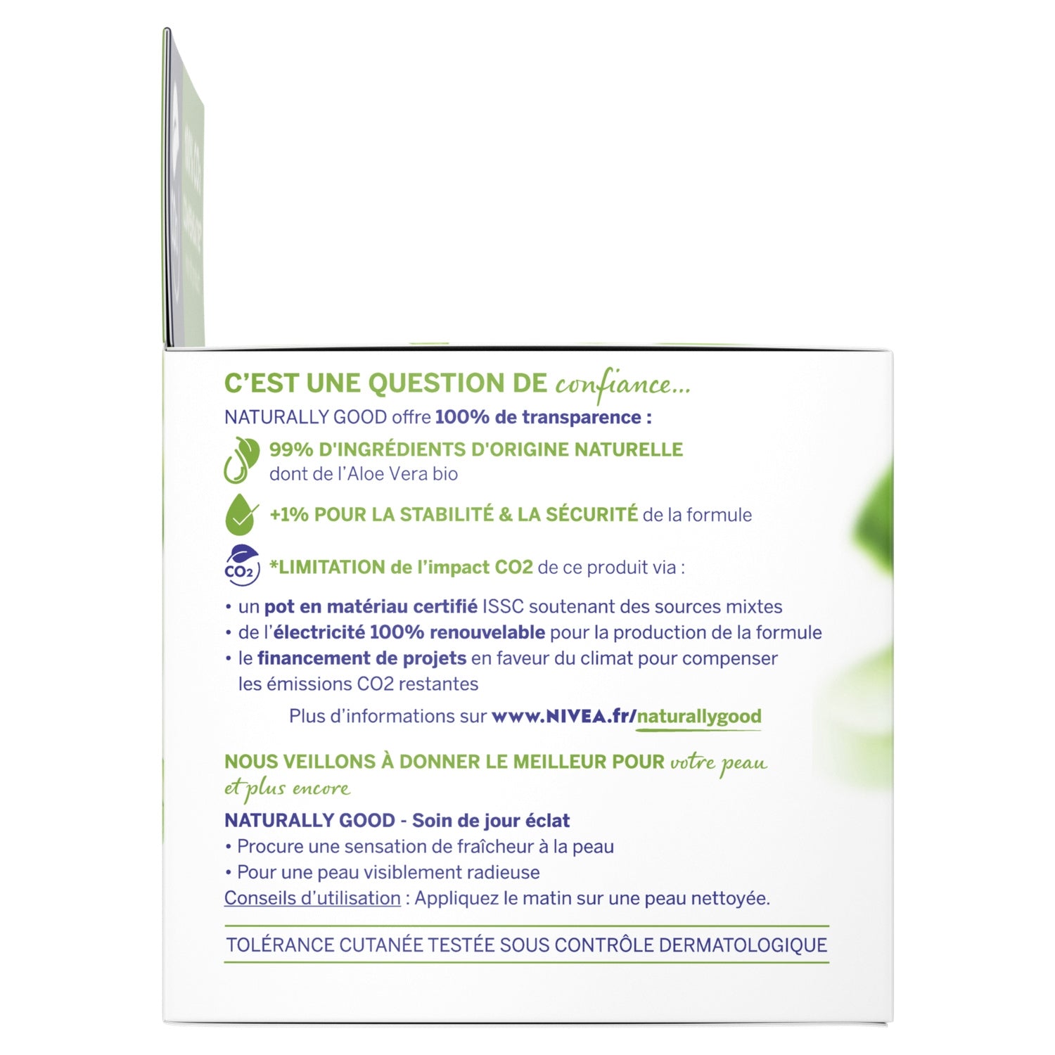 The NATURALLY GOOD range is committed to 100% transparency on all the ingredients contained in its product formulas: - 99% ingredients of natural origin - Its formula with Aloe Vera leaves a feeling of freshness - 100% pleasant formula based on precious jojoba and sweet almond oils - 1% non-natural ingredients, necessary for the stability and preservation of the formula Discover this Naturally Good Radiance Day Care from NIVEA! Ideal for normal skin.