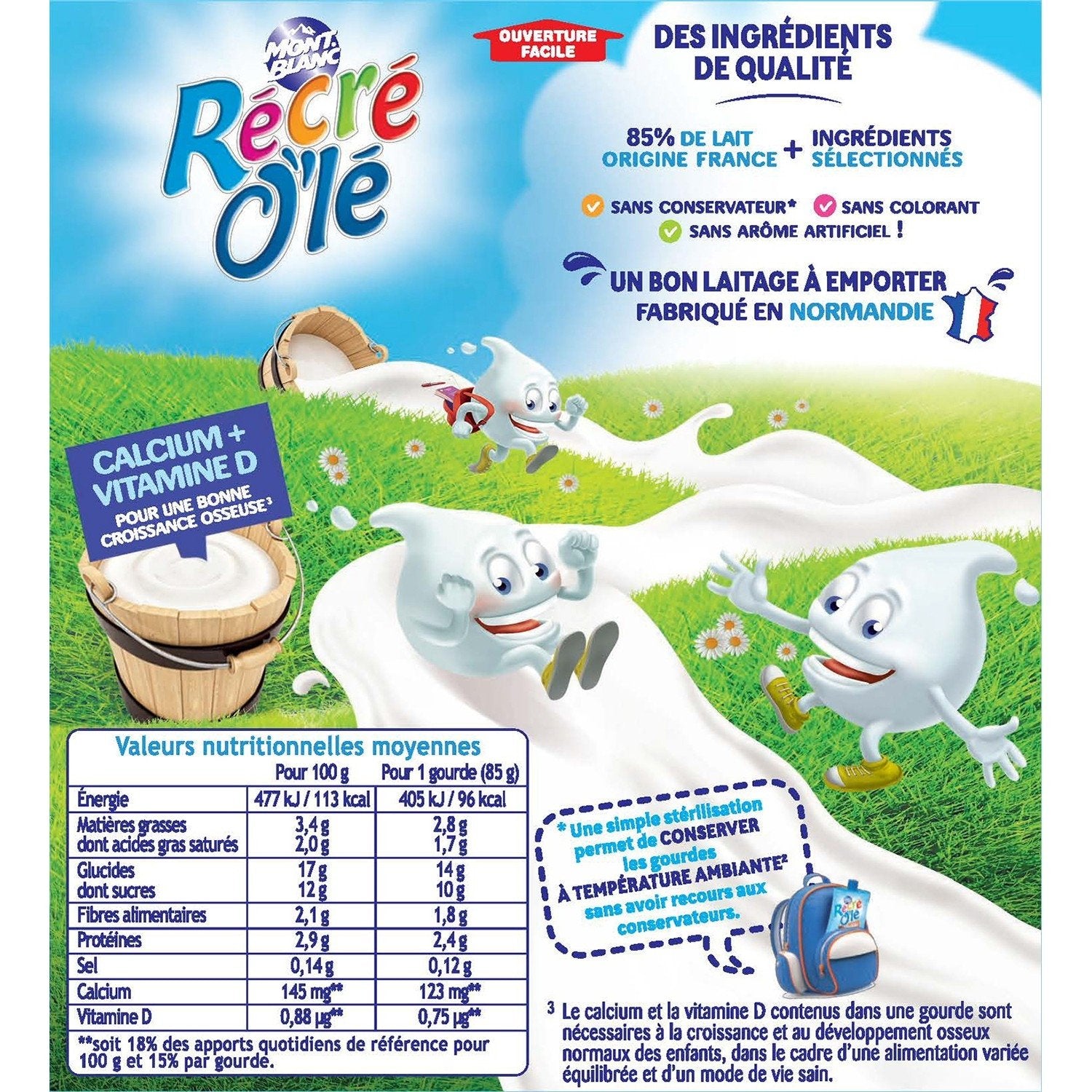 Récré O'lé® is a practical, creamy and delicious dairy snack designed for children! 85% milk, a source of calcium and vitamin D for good bone growth*, and all this with a Nutri-Score B! Thanks to simple sterilization, Récré O'lé® pouches can be stored at room temperature**, so they can be taken everywhere for their greatest pleasure! *The vitamin D and calcium contained in a pouch contribute to the maintenance of normal bones as part of a balanced diet and a healthy lifestyle. ** Before opening, store at room temperature. After opening, keep refrigerated at +4°C and consume within 24 hours.