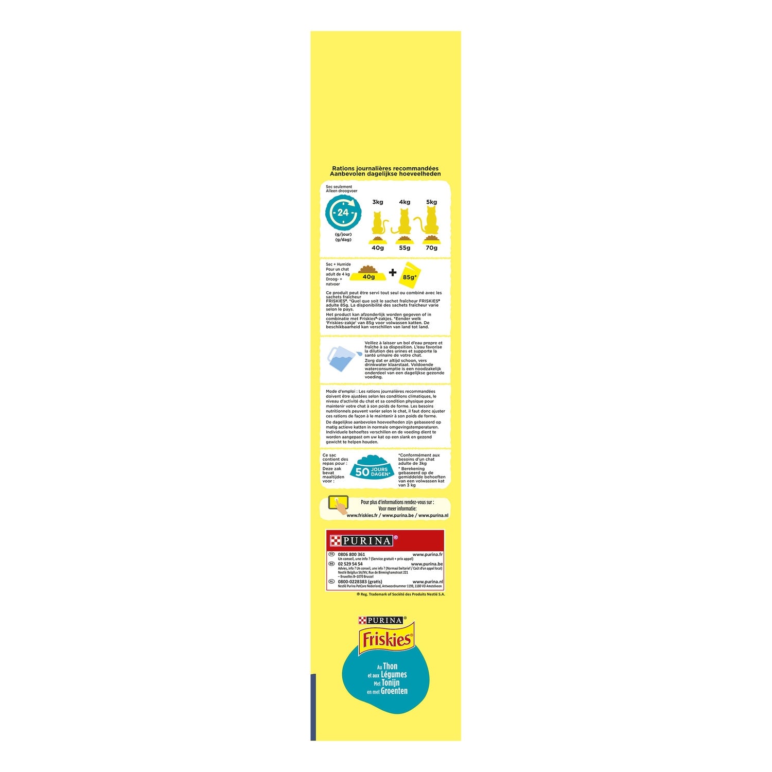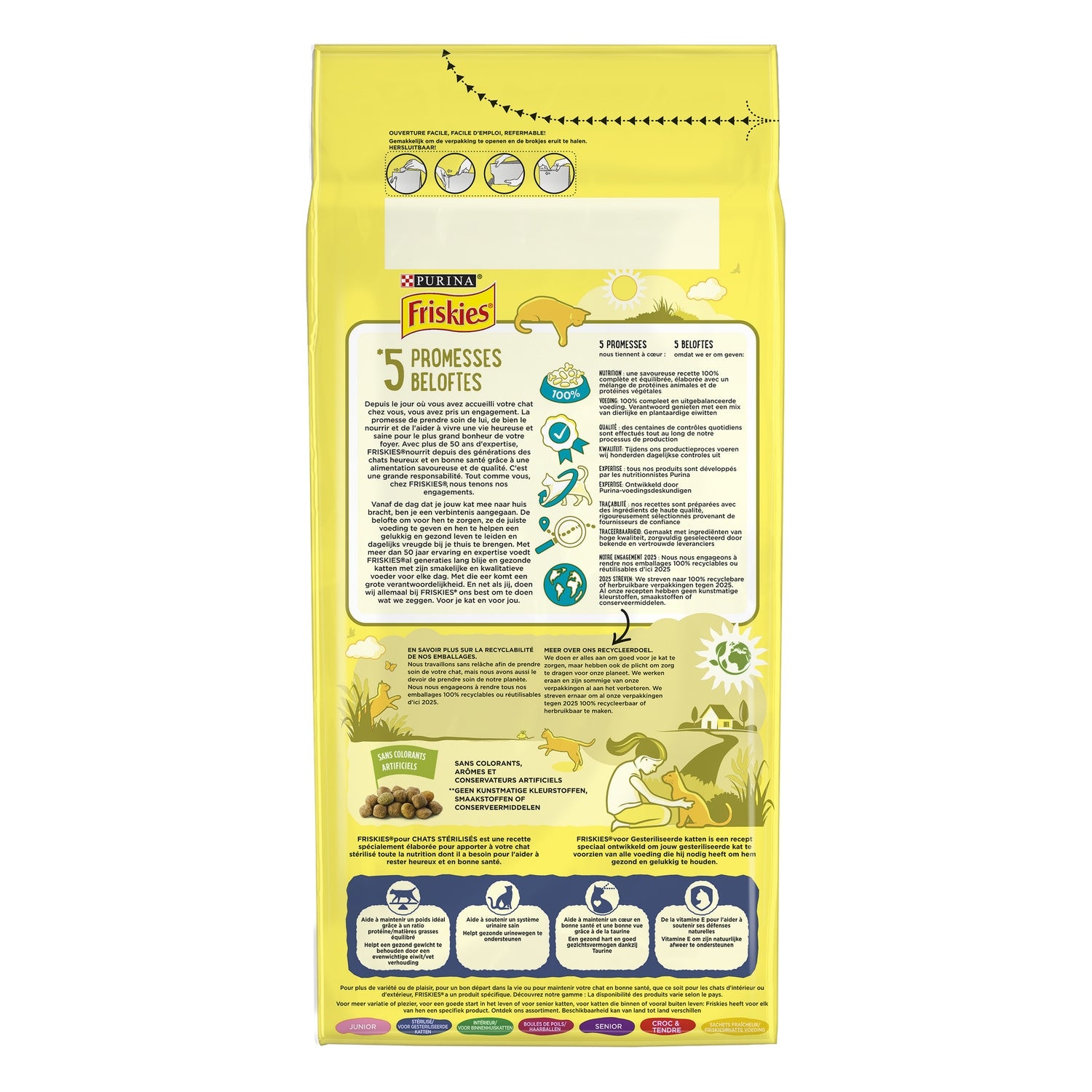 The 5 FRISKIES® Promises. From the day you welcomed your cat into your home, you made a commitment. A promise to care for them, feed them well, and help them live a happy and healthy life for the greater happiness of your home. With over 50 years of expertise, FRISKIES® has been feeding happy and healthy cats for generations with tasty, high-quality food. It's a big responsibility. Just like you, at FRISKIES®, we keep our commitments and 5 promises are important to us: - Nutrition: a tasty recipe that is 100% complete and balanced, made with a blend of animal and plant proteins - Quality: hundreds of daily checks are carried out throughout our production process - Expertise: all our products are developed by Purina nutritionists - Traceability: our recipes are prepared with high-quality ingredients, rigorously selected from trusted suppliers - Our 2025 commitment: We are committed to making our packaging 100% recyclable or reusable by 2025 All FRISKIES® recipes are free from artificial colors, flavors and preservatives.