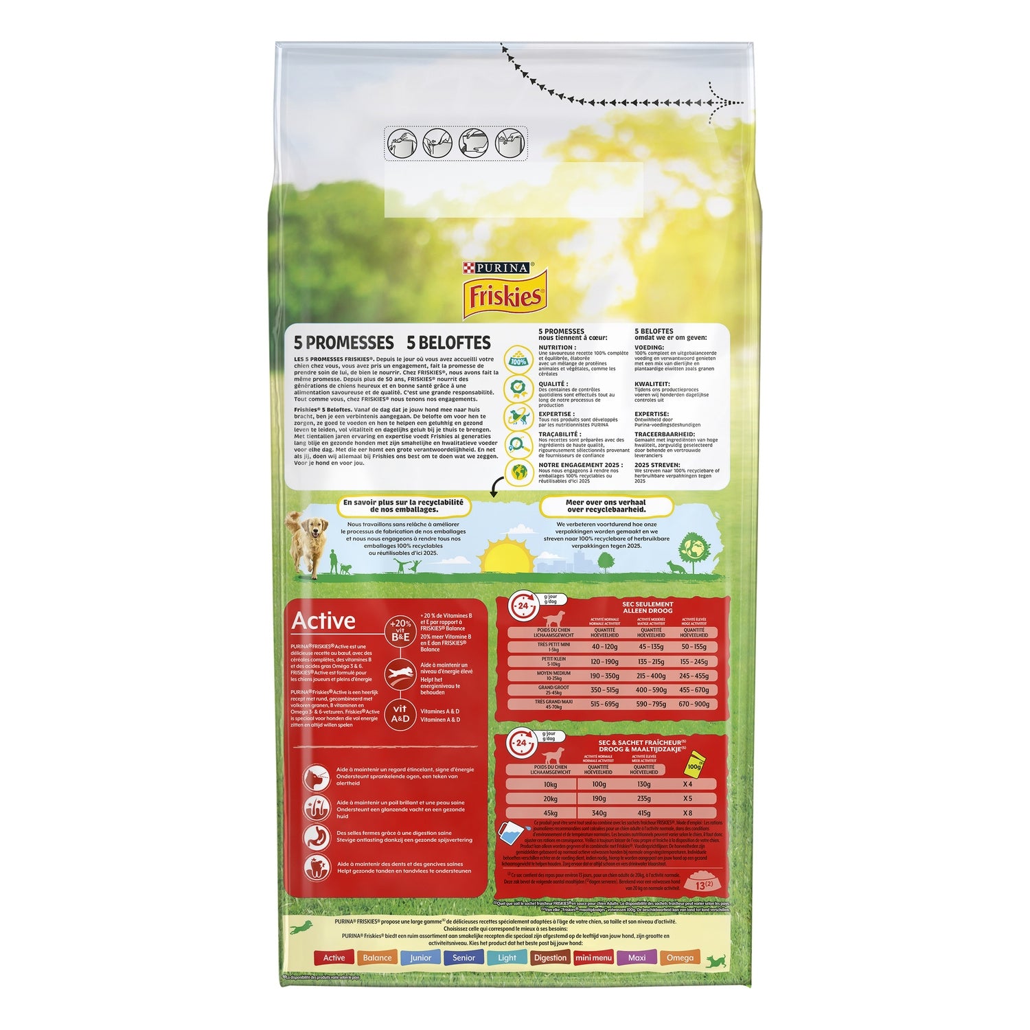 The 5 FRISKIES® Promises From the day you welcomed your dog into your home, you made a commitment, a promise to take care of him, to feed him well. At FRISKIES®, we have made the same promise. For over 50 years, FRISKIES® has been feeding generations of happy and healthy dogs with tasty, high-quality food. It's a big responsibility. Just like you, at FRISKIES® we keep our commitments and 5 promises are important to us: 1) Nutrition: A tasty, 100% complete and balanced recipe, made with a blend of animal and plant proteins, such as cereals. 2) Quality: Hundreds of daily checks are carried out throughout our production process. 3) Expertise: All our products are developed by PURINA nutritionists. 4) Traceability: Our recipes are prepared with high-quality, rigorously selected ingredients from trusted suppliers. 5) Our 2025 Commitment: We are committed to making our packaging 100% recyclable or reusable by 2025. All FRISKIES® recipes are free from artificial colors, flavors, and preservatives.