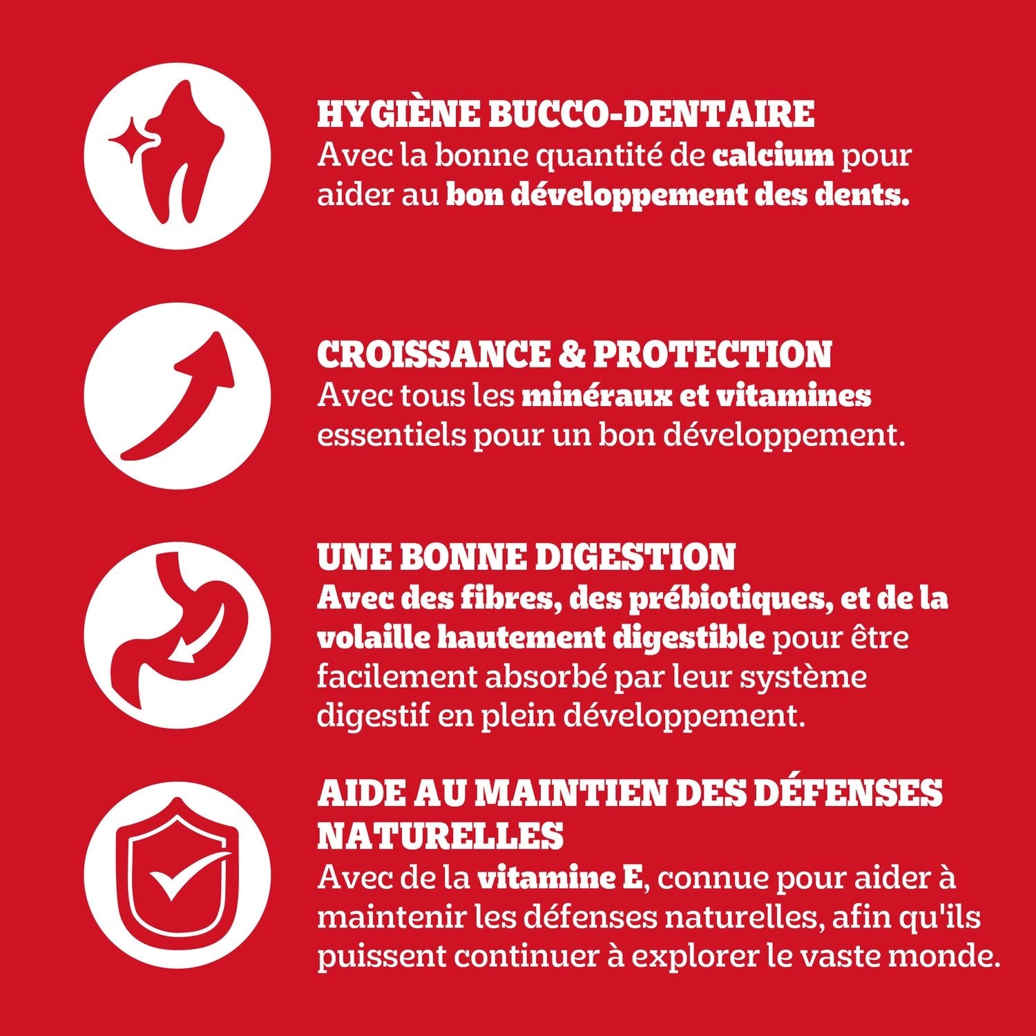 Complete food for junior dogs - with poultry and vegetables. Pedigree® Junior dry food provides your puppy with a 100% complete and balanced meal, adapted to their size and age, with fiber, prebiotics, and highly digestible poultry to be easily absorbed by their developing digestive system. All this with no added artificial flavors or colors and no palm oil. During the first year of life, puppies need specific nutrition to ensure optimal development. Pedigree® Junior meals are complete and balanced and provide essential minerals and vitamins to help puppies grow well. Developed with our nutritionists and veterinarians at the Waltham Centre, Pedigree® dry food is formulated to nutritionally cover four universal dog needs: dog food that helps maintain natural defenses, promotes healthy skin and coat, contributes to optimal digestion and good oral hygiene.