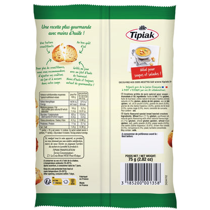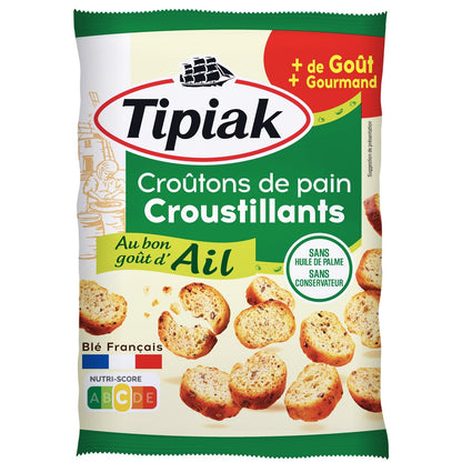 Discover Tipiak's new toasted croutons. With a delicious garlic flavor, they're light, crispy, and oven-browned, with seeds (flax, quinoa, poppy) for added indulgence and fiber. 100% French wheat. No preservatives. No palm oil. Made in Normandy, Pont l'Evêque.